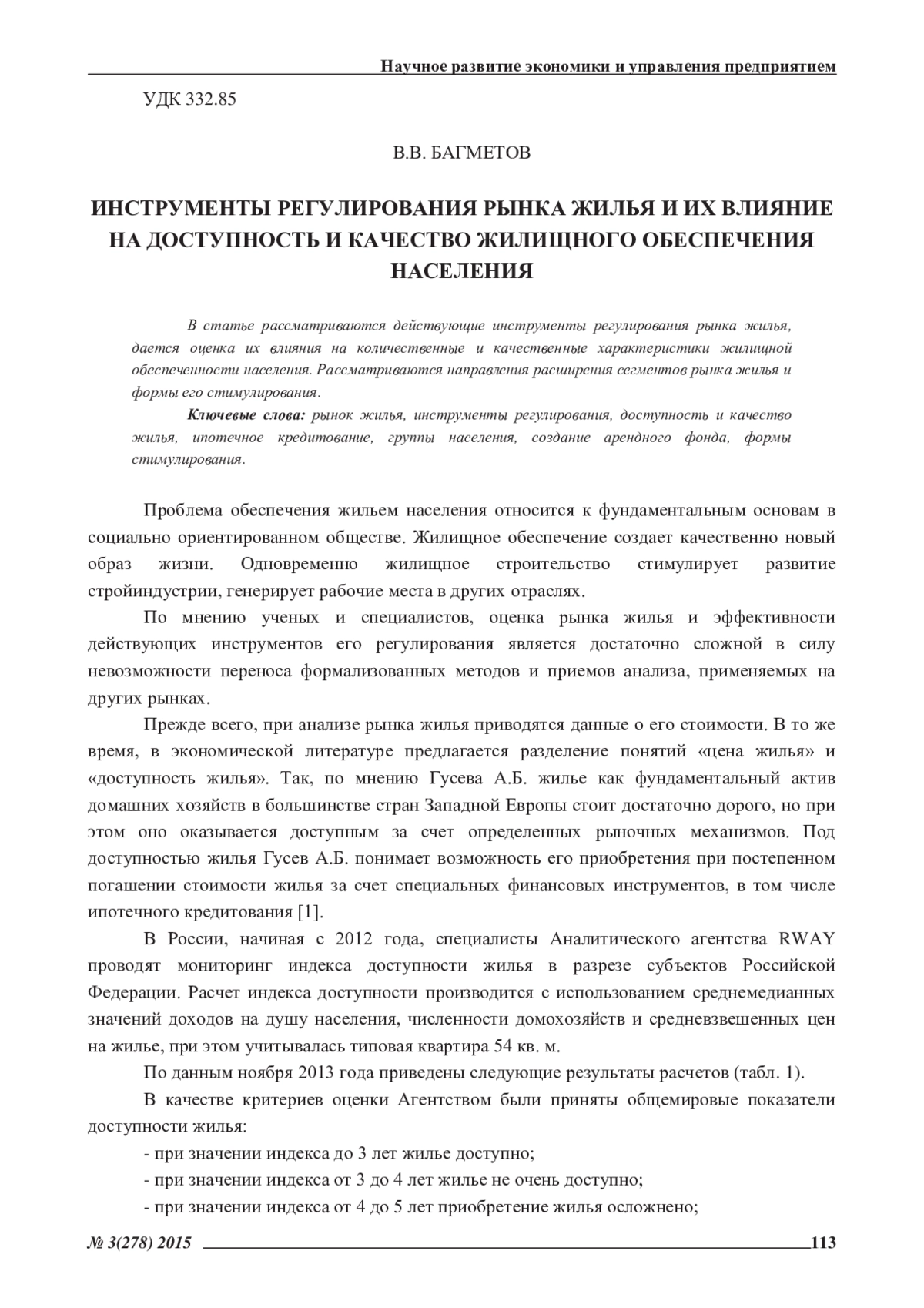 В статье рассматриваются действующие инструменты регулирования рынка жилья, дается оценка их влияния на количественные и качественные характеристики жилищной обеспеченности населения. Рассматриваются направления расширения сегментов рынка жилья и формы его стимулирования