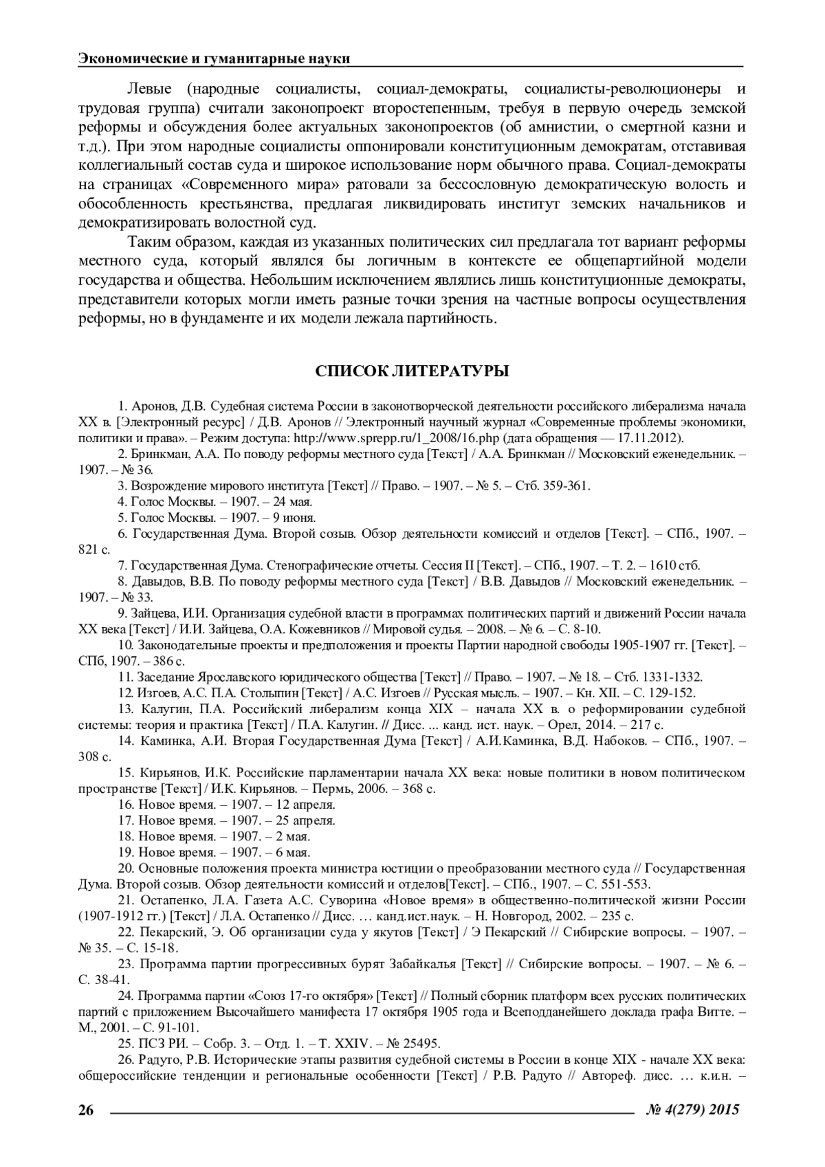 26. Радуто, Р.В. Исторические этапы развития судебной системы в России в конце XIX - начале XX века: общероссийские тенденции и региональные особенности [Текст] / Р.В. Радуто // Автореф. дисс. … к.и.н. - № 4(279) 2015 Н аука социаль ного управ ления и общес тв енного развития Пятигорск, 2011. - 26 с. EDN: QFHSZD