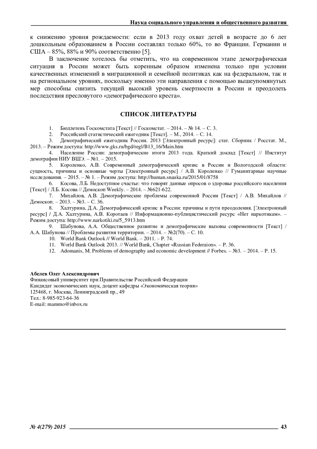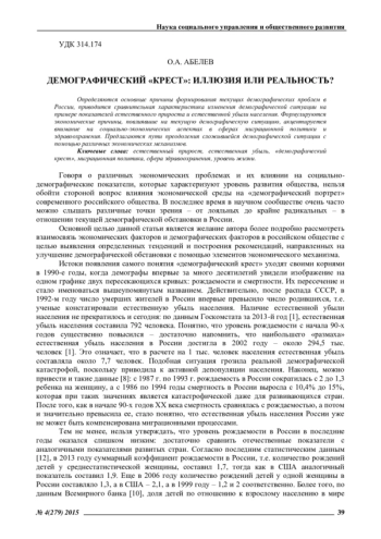 АБЕЛЕВ О. А. ДЕМОГРАФИЧЕСКИЙ "КРЕСТ": ИЛЛЮЗИЯ ИЛИ РЕАЛЬНОСТЬ? // ЭКОНОМИЧЕСКИЕ И ГУМАНИТАРНЫЕ НАУКИ. 2015. № 4 (279)