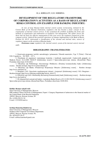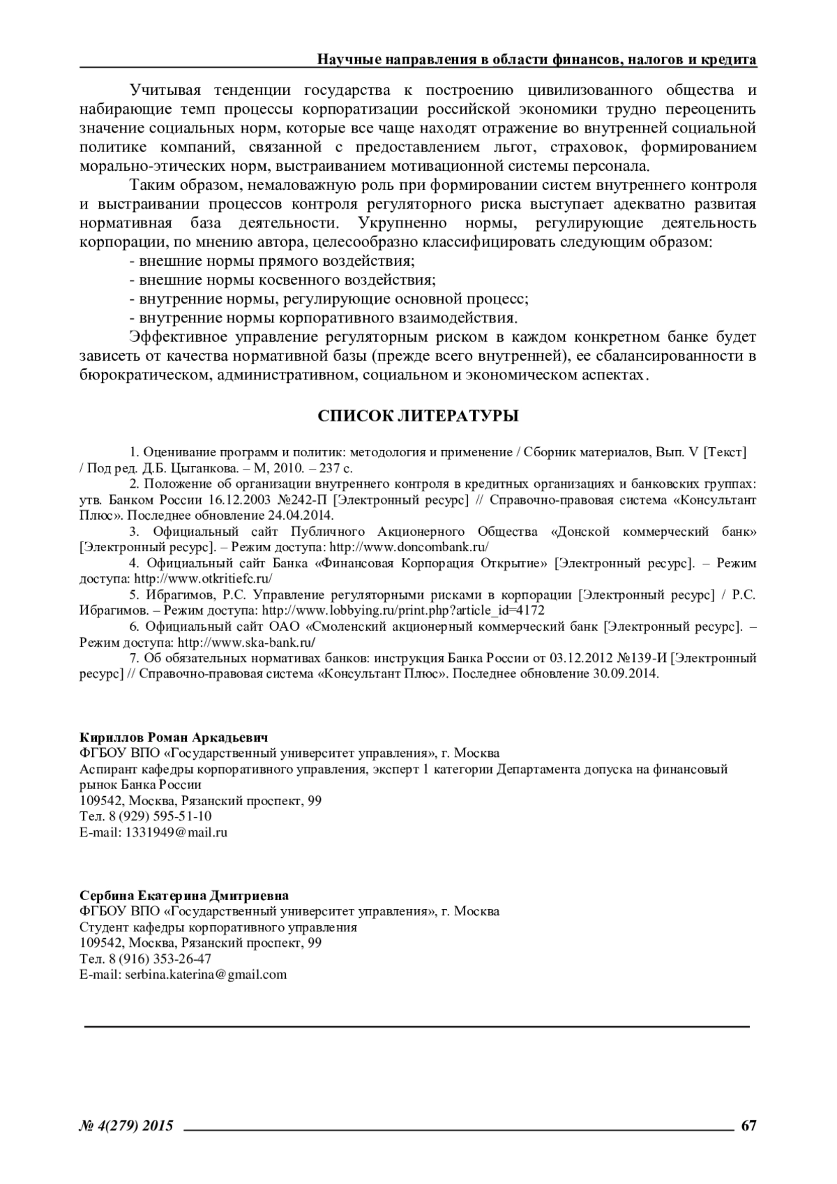 КИРИЛЛОВ Р. А., СЕРБИНА Е. Д. РАЗВИТИЕ НОРМАТИВНОЙ БАЗЫ ДЕЯТЕЛЬНОСТИ КОРПОРАЦИЙ КАК ОСНОВЫ УПРАВЛЕНИЯ РЕГУЛЯТОРНЫМ РИСКОМ(НА ПРИМЕРЕ КОМПАНИЙ БАНКОВСКОЙ СФЕРЫ) // ЭКОНОМИЧЕСКИЕ И ГУМАНИТАРНЫЕ НАУКИ. 2015. № 4 (279)