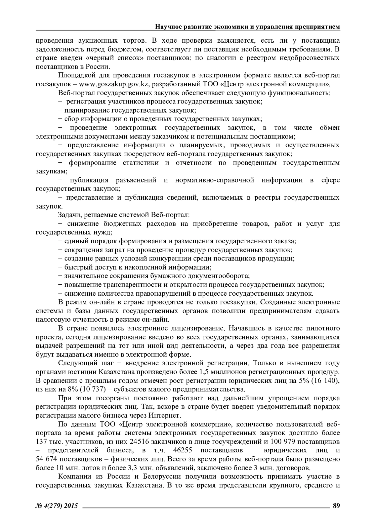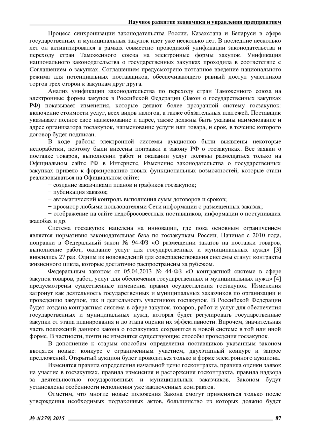 В работе проведен анализ национальных законодательств Республики Казахстан, Республики Беларусь и Российской Федерации в сфере электронных закупок после заключения между ними Соглашения о государственных (муниципальных) закупках от 09.12.2010 года [2]: – в Российской Федерации (Закон 94-ФЗ [3] и Закон 44-ФЗ [4]); в Республике Беларусь (Закон Республики Беларусь от 13 июля 2012 г. No 419-З); в Республике Казахстан (Закон РК от 21.07.2007 года No 303-III «О государственных закупках» (с изменениями и дополнениями по состоянию на 15.01.2014 г.)