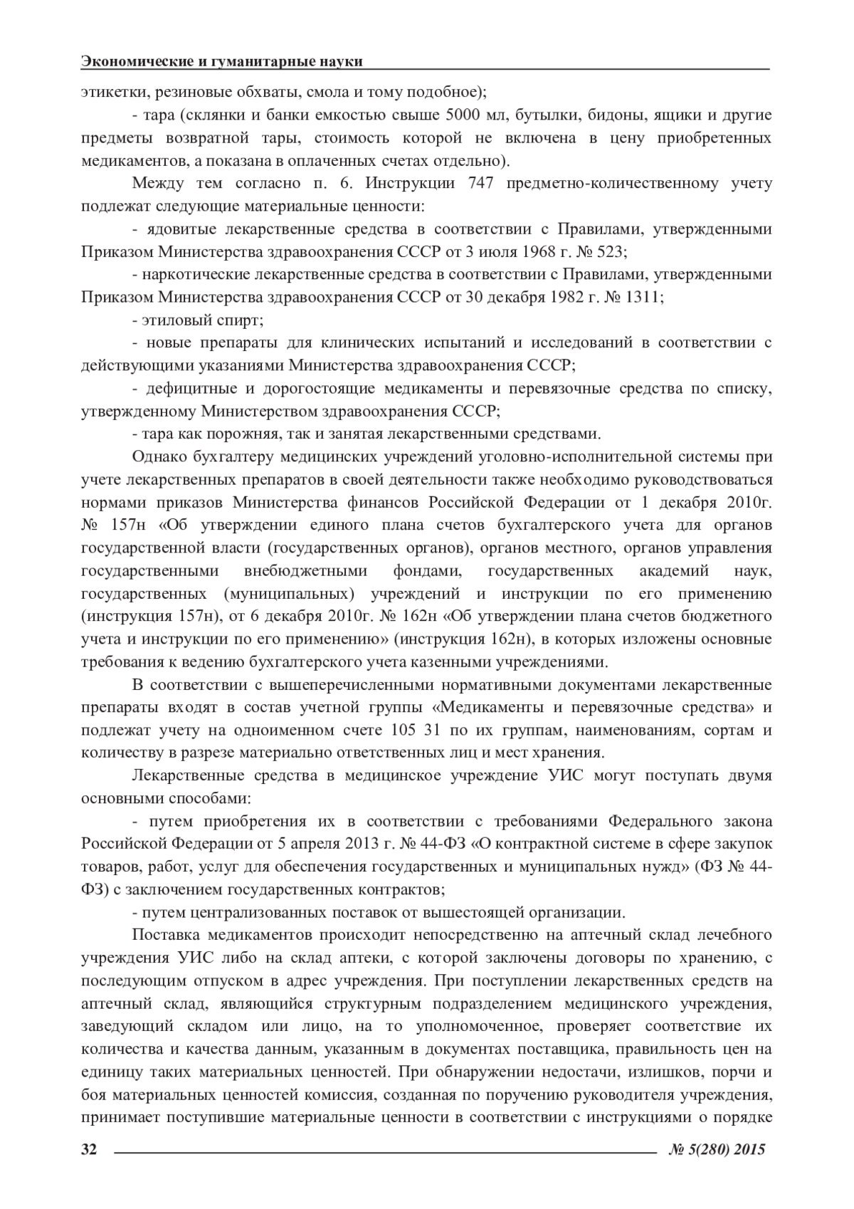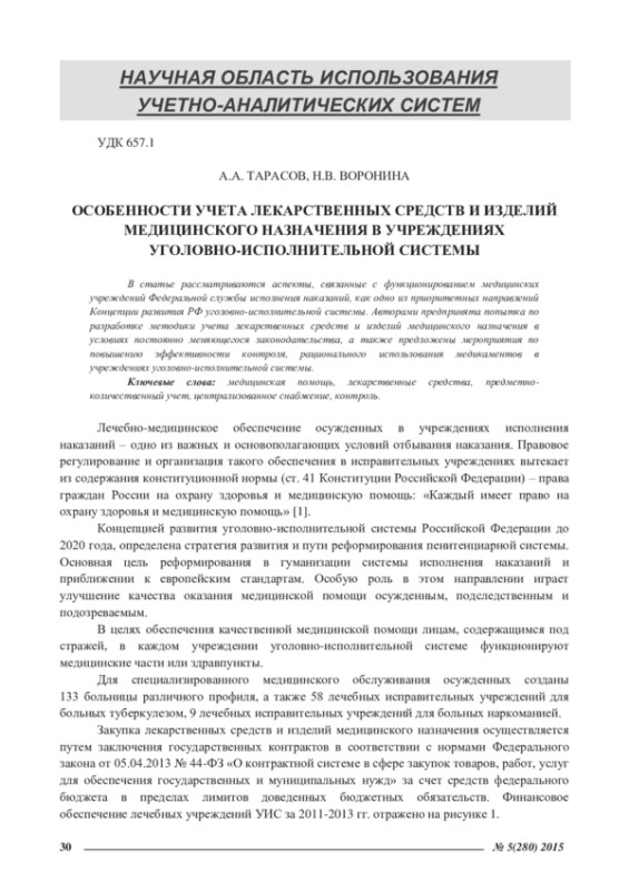 В статье рассматриваются аспекты, связанные с функционированием медицинских учреждений Федеральной службы исполнения наказаний, как одно из приоритетных направлений Концепции развития РФ уголовно-исполнительной системы. Авторами предпринята попытка по разработке методики учета лекарственных средств и изделий медицинского назначения в условиях постоянно меняющегося законодательства, а также предложены мероприятия по повышению эффективности контроля, рационального использования медикаментов в учреждениях уголовно-исполнительной системы