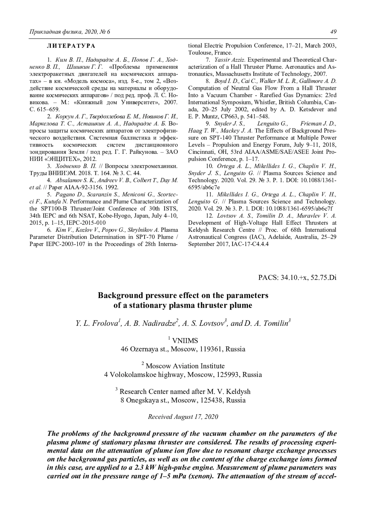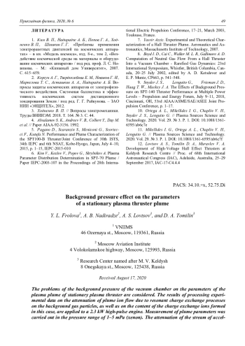 Фролова Ю. Л., Надирадзе А. Б., Ловцов А. С., Томилин Д. А. Влияние давления фонового газа на параметры струи стационарного плазменного двига-теля 45