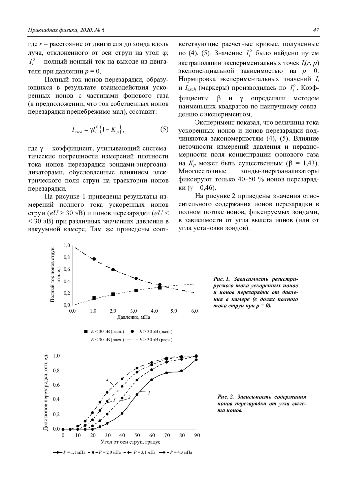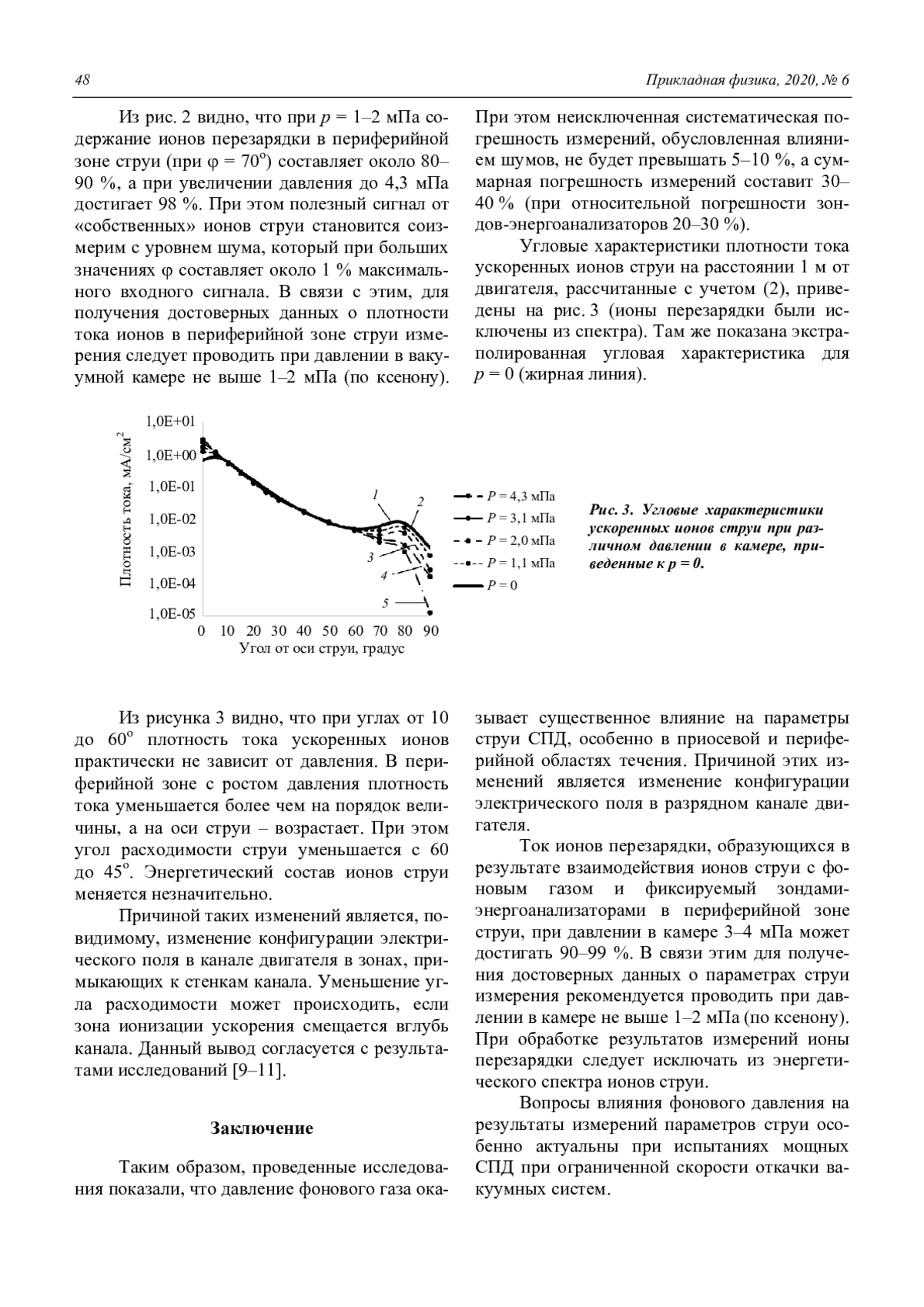 Таким образом, проведенные исследования показали, что давление фонового газа оказывает существенное влияние на параметры струи СПД, особенно в приосевой и периферийной областях течения. Причиной этих изменений является изменение конфигурации электрического поля в разрядном канале двигателя. Ток ионов перезарядки, образующихся в результате взаимодействия ионов струи с фоновым газом и фиксируемый зондамиэнергоанализаторами в периферийной зоне струи, при давлении в камере 3–4 мПа может достигать 90–99 %. В связи этим для получения достоверных данных о параметрах струи измерения рекомендуется проводить при давлении в камере не выше 1–2 мПа (по ксенону). При обработке результатов измерений ионы перезарядки следует исключать из энергетического спектра ионов струи. Вопросы влияния фонового давления на результаты измерений параметров струи особенно актуальны при испытаниях мощных СПД при ограниченной скорости откачки вакуумных систем.