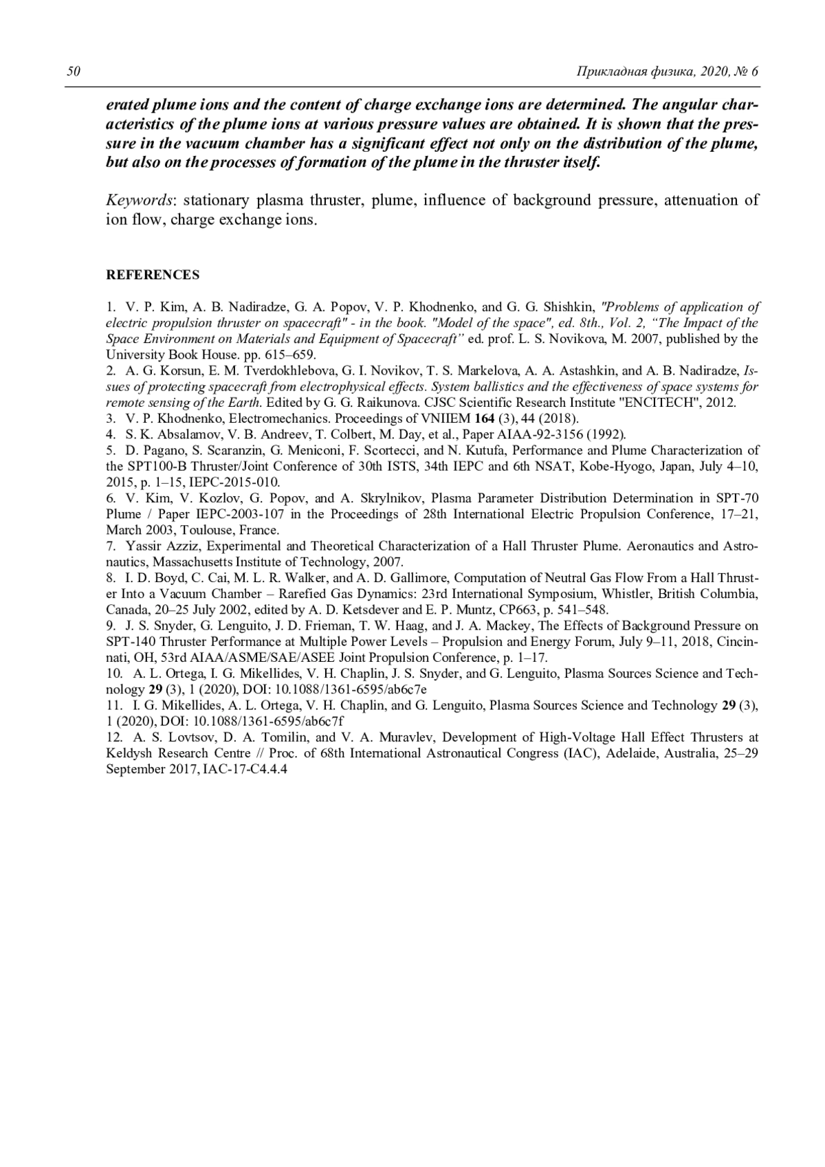 1. V. P. Kim, A. B. Nadiradze, G. A. Popov, V. P. Khodnenko, and G. G. Shishkin, “Problems of application of electric propulsion thruster on spacecraft” - in the book. “Model of the space”, ed. 8th., Vol. 2, “The Impact of the Space Environment on Materials and Equipment of Spacecraft” ed. prof. L. S. Novikova, M. 2007, published by the University Book House. pp. 615–659.