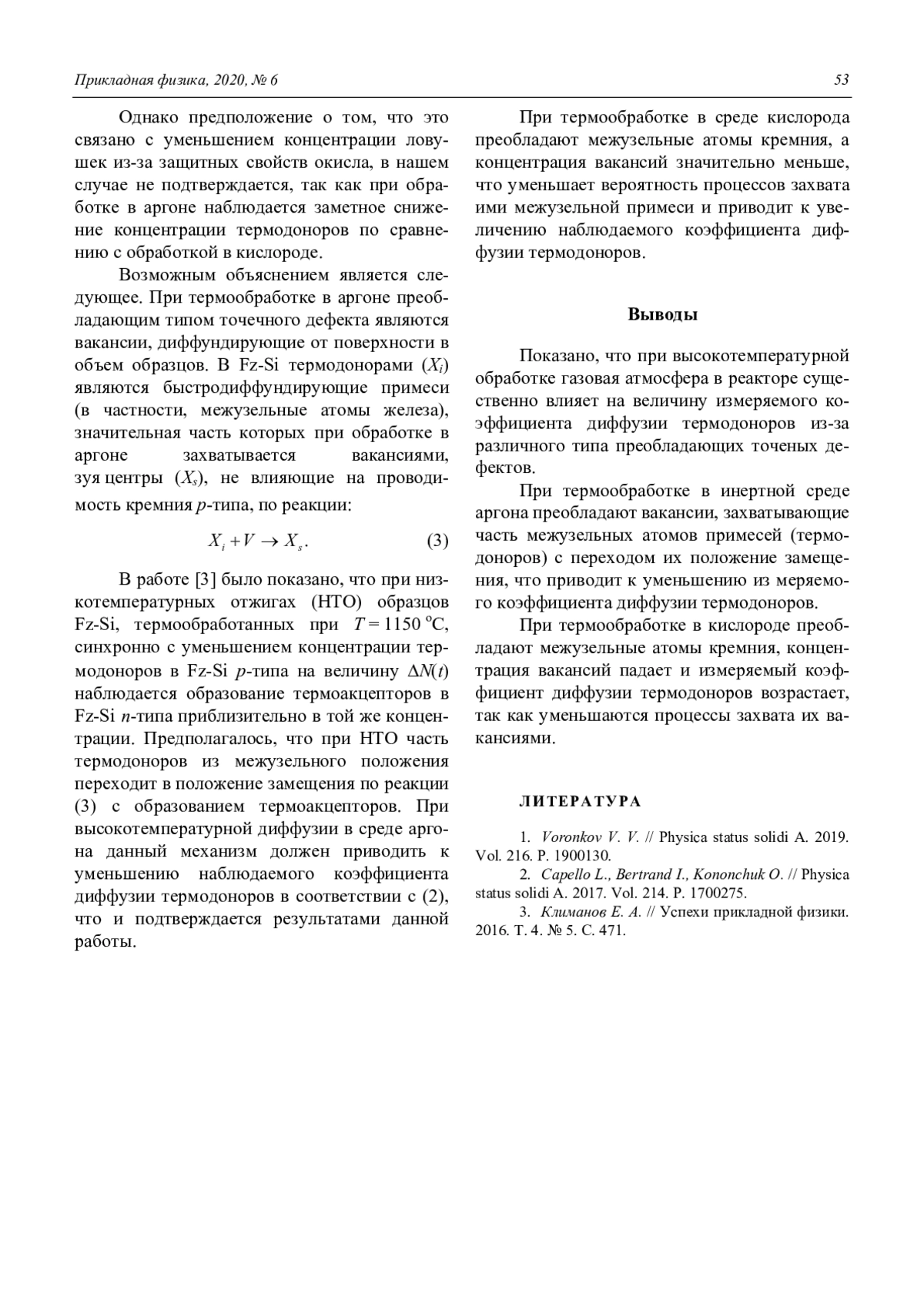 КЛИМАНОВ Е. А. ВЛИЯНИЕ ГАЗОВОЙ СРЕДЫ НА ДИФФУЗИЮ ТЕРМОДОНОРОВ В КРЕМНИИ // ПРИКЛАДНАЯ ФИЗИКА. 2020. №6