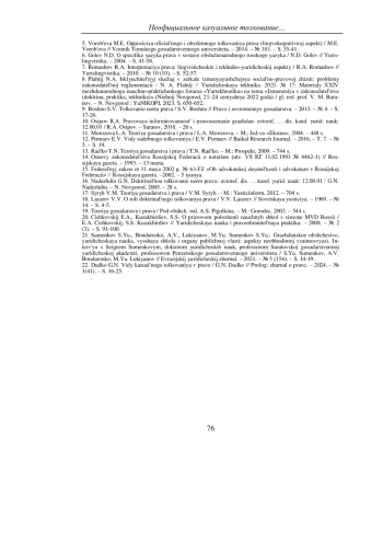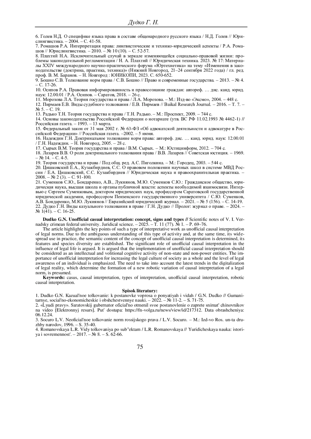 ДУДКО Г. Н. НЕОФИЦИАЛЬНОЕ КАЗУАЛЬНОЕ ТОЛКОВАНИЕ: ПОНЯТИЕ, ПРИЗНАКИ И ВИДЫ // УЧЕНЫЕ ЗАПИСКИ КРЫМСКОГО ФЕДЕРАЛЬНОГО УНИВЕРСИТЕТА ИМЕНИ В. И. ВЕРНАДСКОГО. ЮРИДИЧЕСКИЕ НАУКИ. 2025. ТОМ 11(77). №1