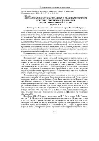 3. Захарцев, С. И. Правовой режим контртеррористической операции как особый порядок правового регулирования общественных отношений, возникающих в условиях террористической угрозы / С. И. Захарцев, В. В. Луценко // Юридическая наука: история и современность. - 2022. - № 10. - С. 60-68. EDN: DQTYYA