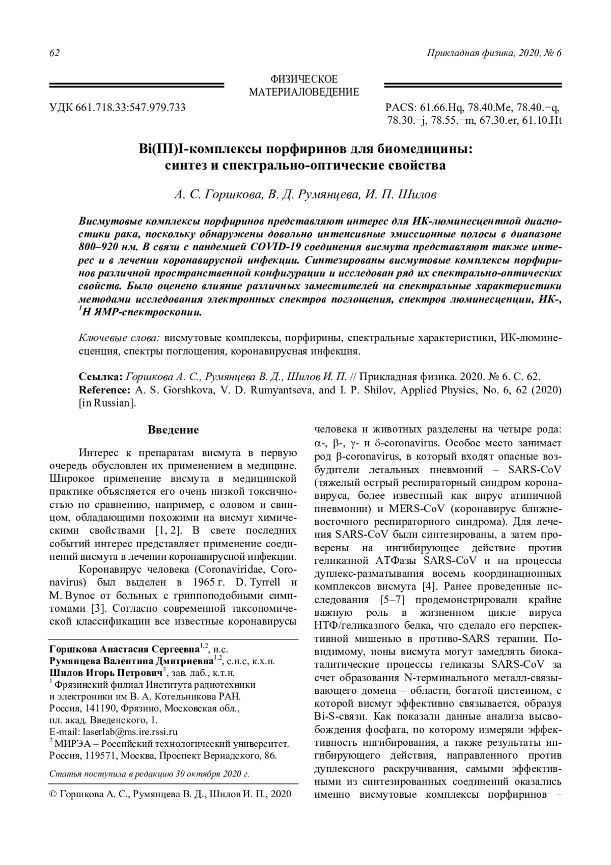 A. S. Gorshkova, V. D. Rumyantseva, and I. P. Shilov Bi(III)I-porphyrins complexes for biomedicine: synthesis and spectral-optical properties 62