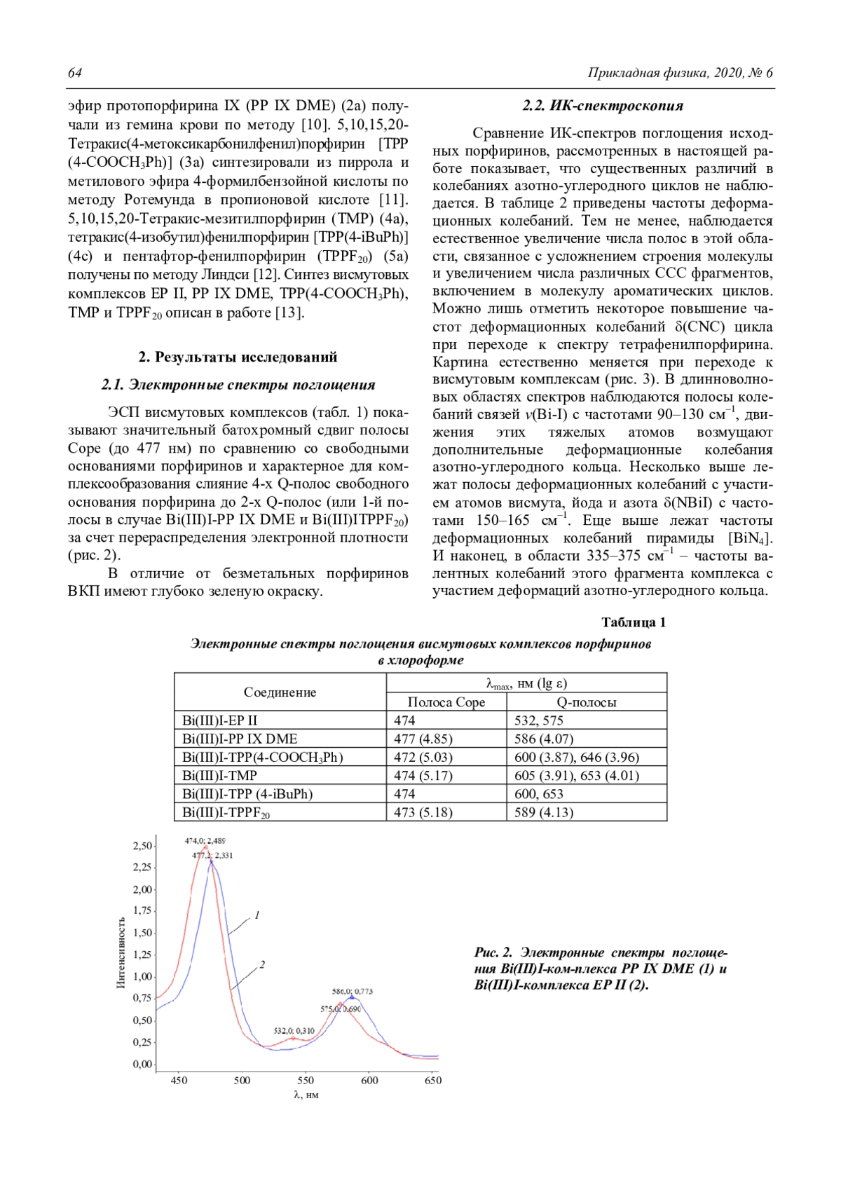 1. Сравнительные исследования ЭСП висмутовых комплексов порфиринов показывают значительный батохромный сдвиг полосы Соре (до 477 нм) по сравнению со свободными основаниями порфиринов. 2. В ИК-спектрах при координации иона висмута с порфириновыми макроциклами появляются полосы колебаний с участием связей висмут–йод и висмут–азот в длинноволновых областях спектров. 3. Изучение спектров люминесценции показало, что Bi-комплексы в различных органических растворах имеют двухполосную структуру, причем основная и наиболее интенсивная полоса находится в диапазоне 650–800 нм. Вторая же наблюдаемая у ВКП эмиссионная полоса (800– 920 нм) делает возможным использование данных комплексов для целей люминесцентной диагностики рака.