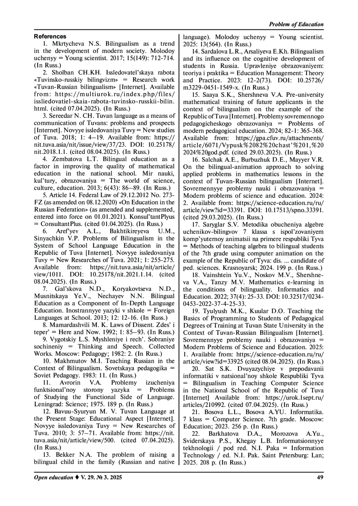 Заключение. Статистические данные анкетного опроса позволили представить билингвальный портрет жителей республики Тыва в целом, и студенческого контингента Тувинского государственного университета в частности. Следует отметить, что для значительного большинства обучаемых тувинский язык является родным, а русский язык – языком обучения. Анализ анкетных данных показывает актуальность и необходимость билингвального обучения предметам в школе и вузе. Эту позицию выразила значительная часть респондентов, включающих преподавателей, родителей и студентов. Результаты исследования позволили определить наиболее предпочтительный формат представления содержания учебных билингвальных ресурсов в синхронном и «перевернутом» виде. Безусловно следует развивать исследования механизмов билингвального мышления и на их основе создавать методические системы билингального обучения предметам в школах и вузах р. Тыва.