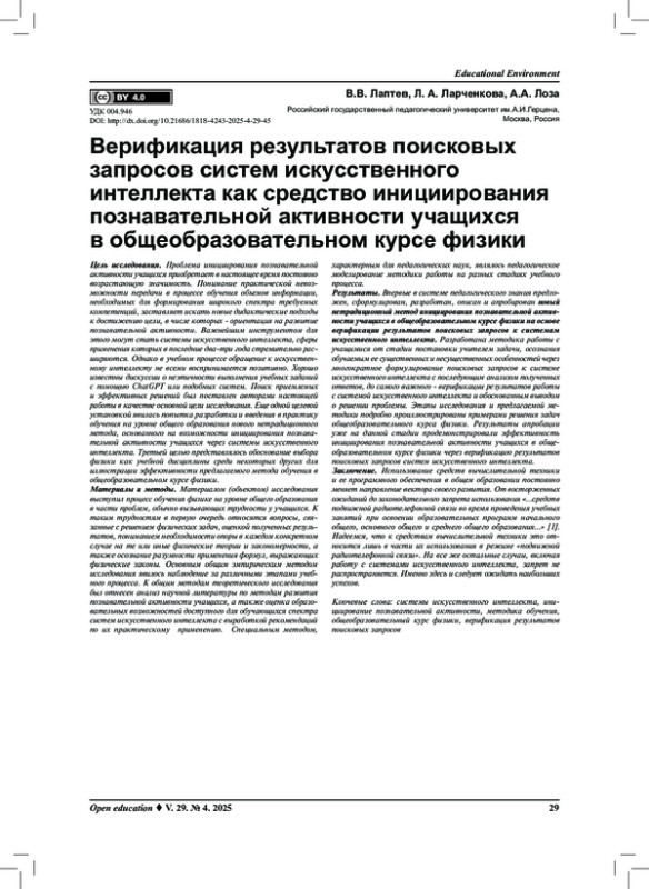 Результаты. Впервые в системе педагогического знания предложен, сформулирован, разработан, описан и апробирован новый нетрадиционный метод инициирования познавательной активности учащихся в общеобразовательном курсе физики на основе верификации результатов поисковых запросов к системам искусственного интеллекта. Разработана методика работы с учащимися от стадии постановки учителем задачи, осознания обучаемым ее существенных и несущественных особенностей через многократное формулирование поисковых запросов к системе искусственного интеллекта с последующим анализом полученных ответов, до самого важного - верификации результатов работы с системой искусственного интеллекта и обоснованным выводом о решении проблемы. Этапы исследования и предлагаемой методики подробно проиллюстрированы примерами решения задач общеобразовательного курса физики. Результаты апробации уже на данной стадии продемонстрировали эффективность инициирования познавательной активности учащихся в общеобразовательном курсе физики через верификацию результатов поисковых запросов систем искусственного интеллекта.
