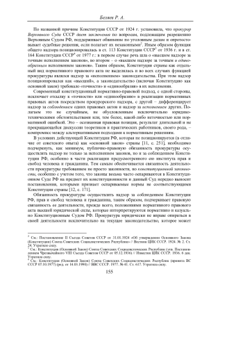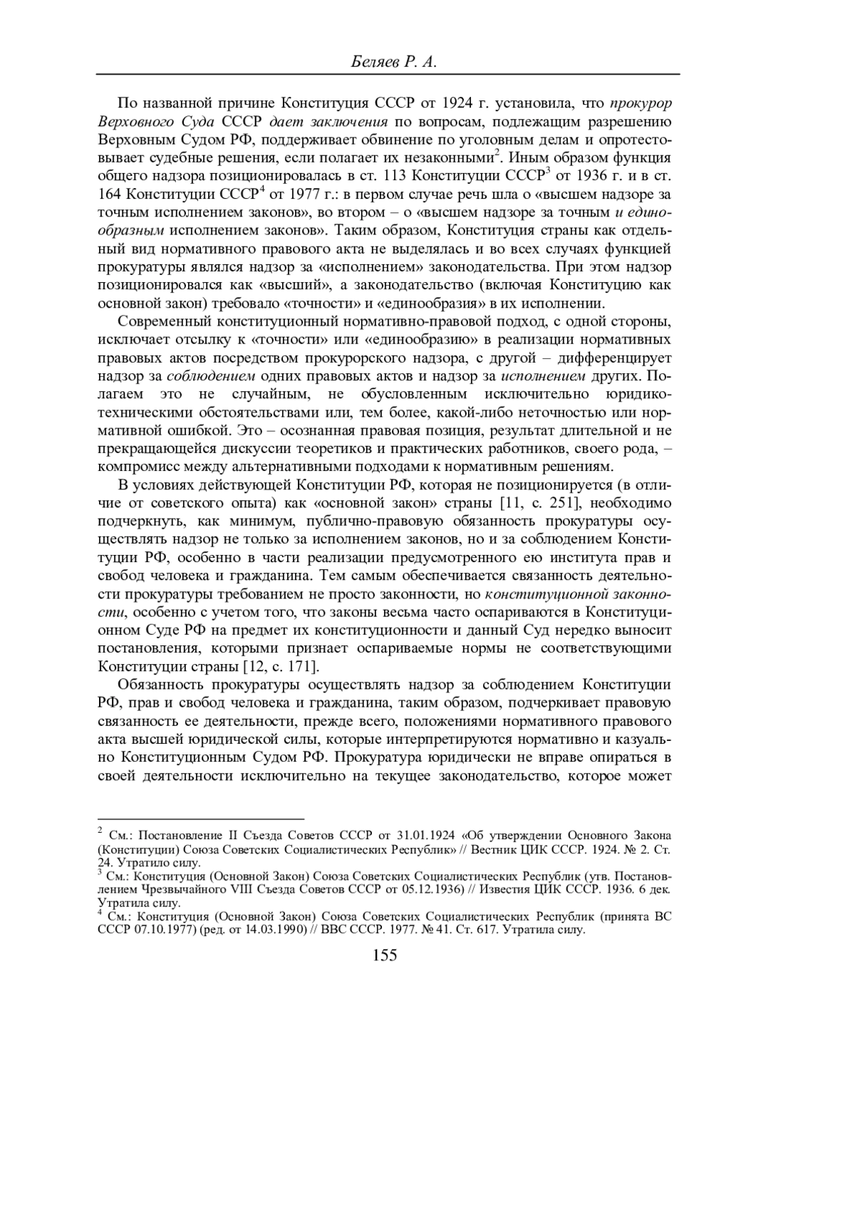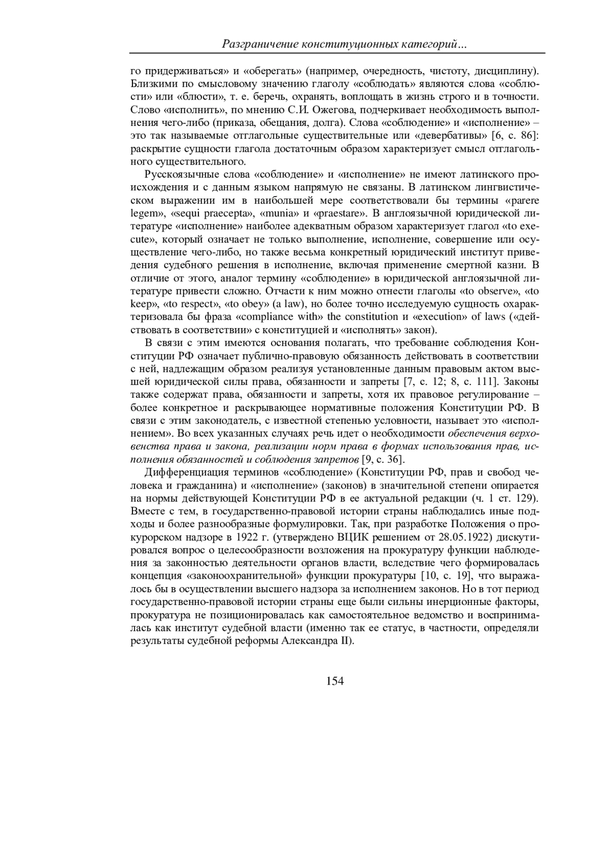Конституция РФ и законодательство о прокуратуре в их действующей редакции сравнительно ясно, четко и последовательно разграничивают прокурорский надзор «за соблюдением» (Конституции РФ, прав и свобод человека и гражданина) и «исполнением» законов [1, с. 67; 2, с. 129].