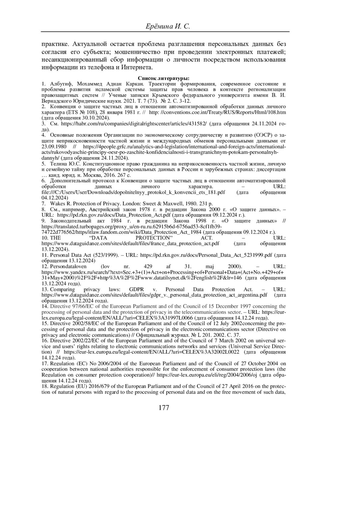 6. Дополнительный протокол к Конвенции о защите частных лиц в отношении автоматизированной обработки данных личного характера. - URL: file:///C:/Users/User/Downloads/dopolnitelnyy_protokol_k_konvencii_ets_181.pdf (дата обращения 04.12.2024).