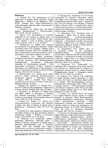4. Семикаленова А.И. Цифровые следы: назначение и производство экспертиз [Электрон. ресурс] // Вестник Университета имени О.Е. Кутафина. 2019. № 5(57). Режим доступа: https://cyberleninka.ru/article/n/tsifrovye-sledynaznachenie-i-proizvodstvo-ekspertiz.