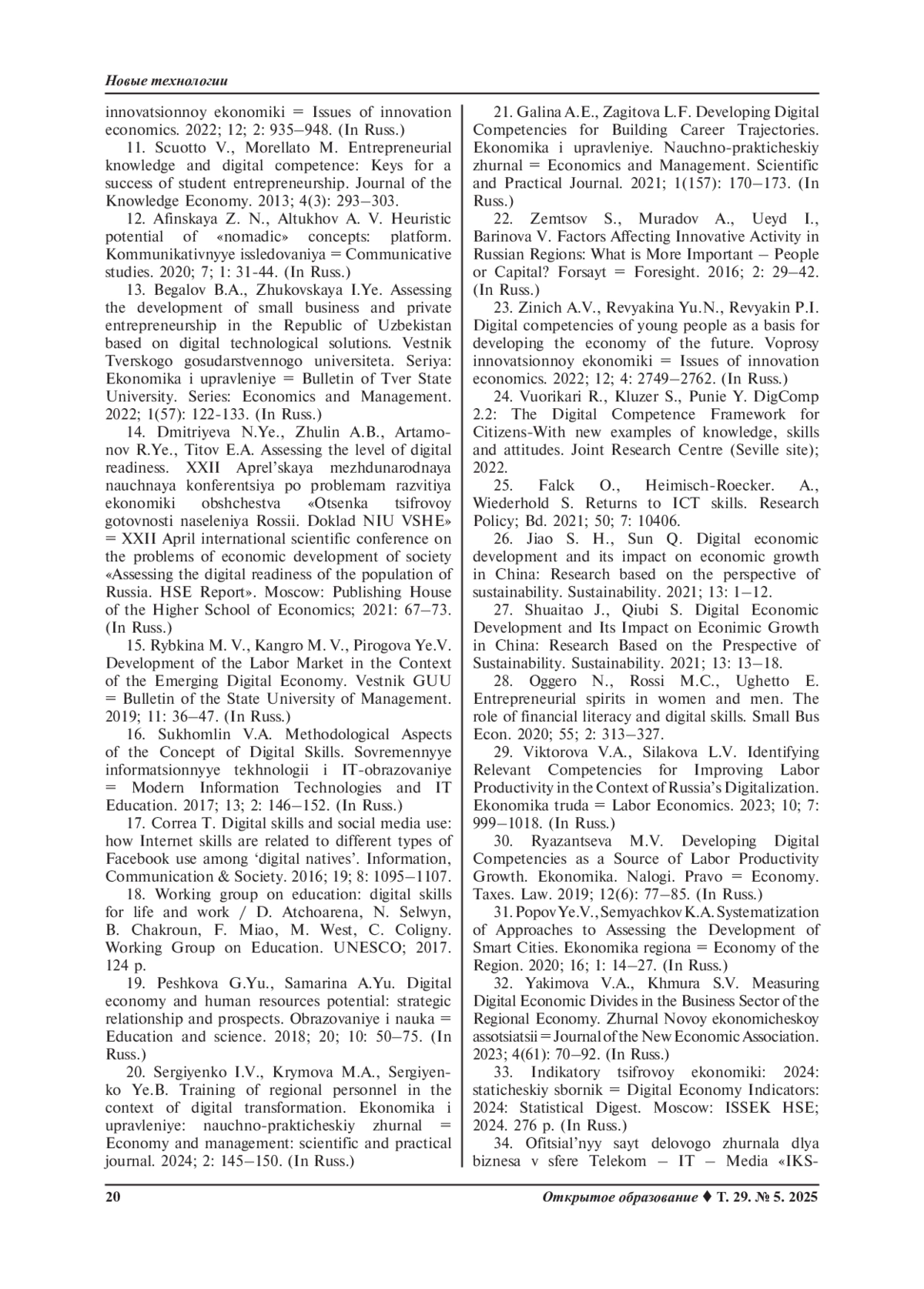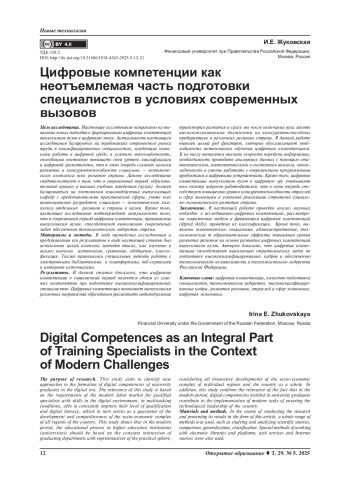 ЖУКОВСКАЯ И. Е. ЦИФРОВЫЕ КОМПЕТЕНЦИИ КАК НЕОТЪЕМЛЕМАЯ ЧАСТЬ ПОДГОТОВКИ СПЕЦИАЛИСТОВ В УСЛОВИЯХ СОВРЕМЕННЫХ ВЫЗОВОВ // ОТКРЫТОЕ ОБРАЗОВАНИЕ. 2025. ТОМ 29, № 5