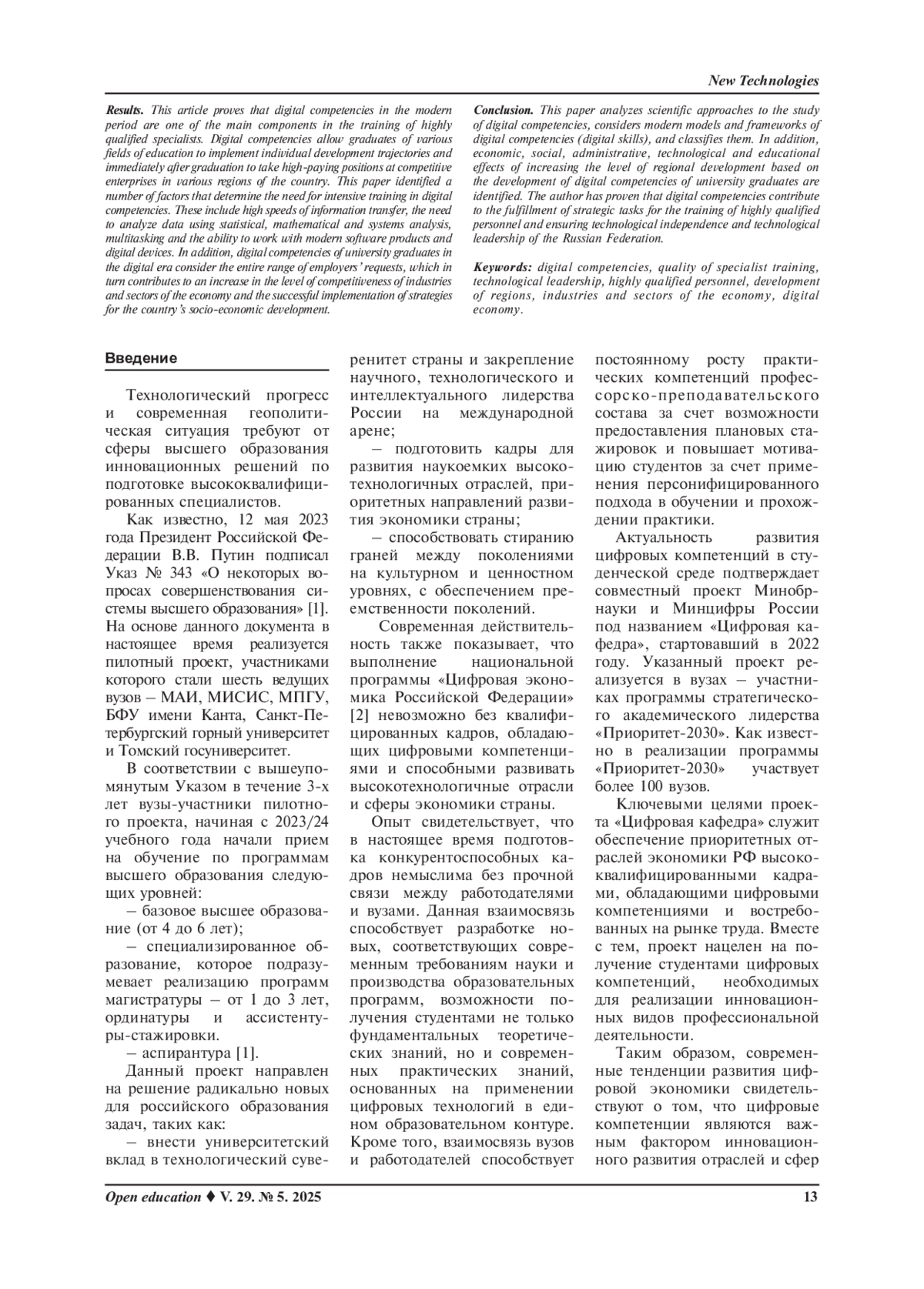 Ключевые фразы: цифровые компетенции, качество подготовки специалистов, технологическое лидерство, высококвалифициро- ванные кадры, развитие регионов, отраслей и сфер экономики, цифровая экономика