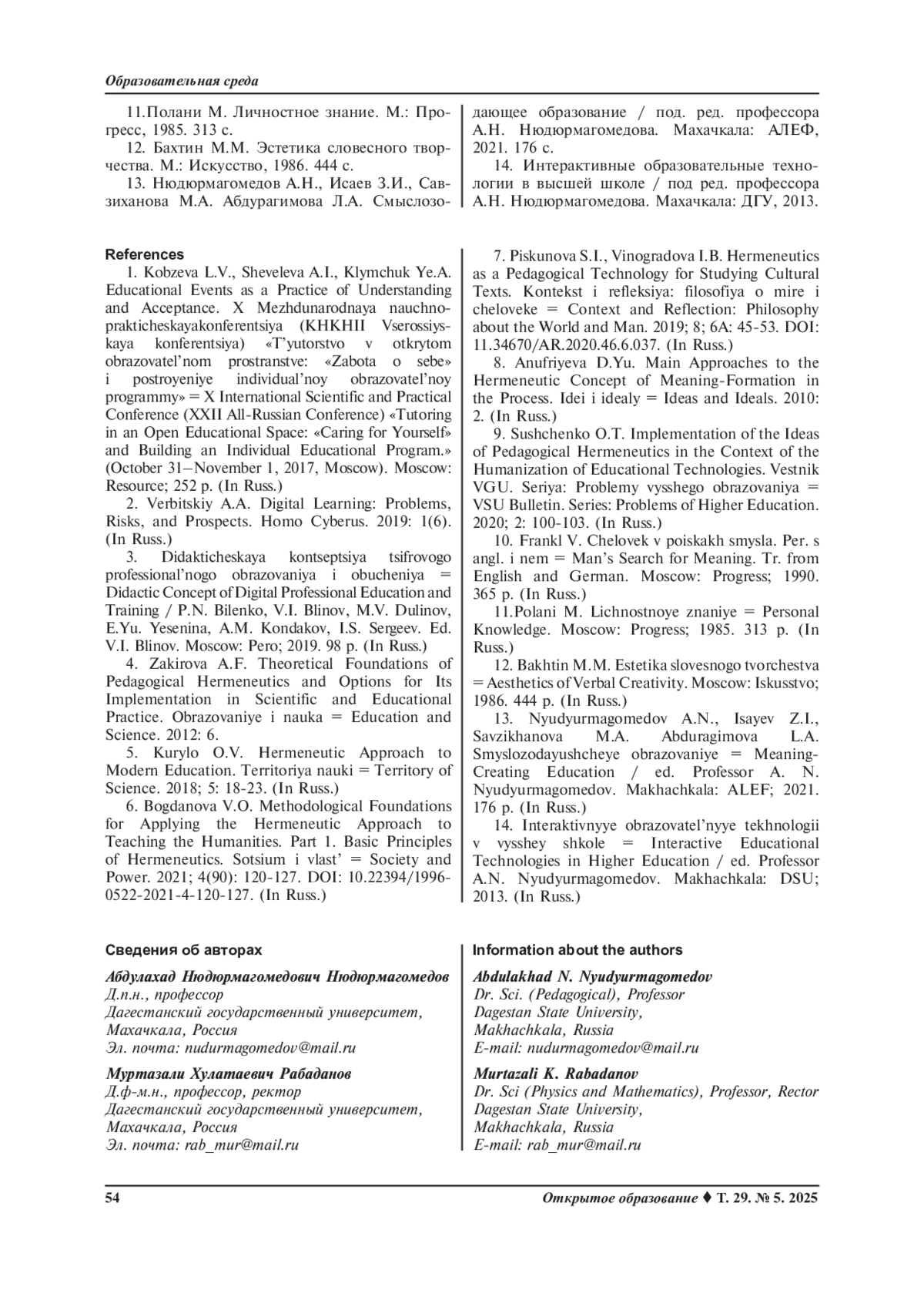 НЮДЮРМАГОМЕДОВ А. Н., РАБАДАНОВ М. Х. ТЕХНОЛОГИИ РЕАЛИЗАЦИИ ГЕРМЕНЕВТИЧЕСКОГО ПОДХОДА К УЧЕБНОМУ ПРОЦЕССУ В ВУЗЕ // ОТКРЫТОЕ ОБРАЗОВАНИЕ. 2025. ТОМ 29, № 5