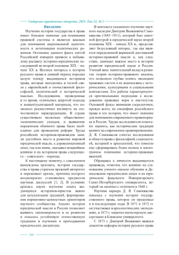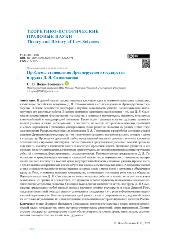 В данной статье рассматриваются ключевые идеи и историко-культурные концепции, изложенные российским историком Д. Я. Самоквасовым в его исследованиях Древнерусского государства. В статье освещается биография и научная деятельность ученого, последовательно анализируются его ключевые работы. В центре внимания настоящего исследования – то, как Д. Я. Самоквасов рассматривает формирование государства в контексте исторических факторов, культурных взаимодействий и международной политики. Также акцент делается и на методологии, использованной ученым в своих исследованиях, в частности, на методе историко-генетических сравнений и методе пережитков. Приводится универсальная схема развития общества на ранних этапах государственности. Раскрываются главные достижения Д. Я. Самоквасова в разработке основных стадий развития Древнерусского государства – от первичного городского поселения к союзу городов и далее к государству. Проводится детальный разбор представлений научного деятеля о генезисе ключевых политических и правовых институтов. Рассматриваются представления ученого о вечевой организации власти, институте княжеской власти и институте жреческой власти. Внимание уделяется и его взглядам на источниковедение, а также роль древнерусских летописей в реконструкции исторических событий и моментов, формировавших государственность. Рассматривается представление Д. Я. Самоквасова о трансформации института княжеской власти после норманнского завоевания, превращение данного института в высший орган государственной власти, связанное ученым, прежде всего, с представлением норманнских князей о Руси как едином собственном владении. Автором настоящей статьи отдельно описываются представления историка права о месте князя и дружины в обеспечении единства Руси, о значении принятия христианства, изменившего понимание роли князя в обществе. Подчеркивается, что Д. Я. Самоквасов не только описывал события и факты, но и считал важным осмысление их причин и последствий, что приводит к более глубокому пониманию социально-политического устройства общества. Основной вывод статьи заключается в том, что труды Д. Я. Самоквасова представляют собой важный вклад в изучение истории государства и права Древней Руси, предлагая системный подход к анализу становления государства и его роли в формировании национальной идентичности. Контекстуализация идей ученого в свете современных исследований делает их не только актуальными, но и необходимыми для понимания историко-правового наследия России.