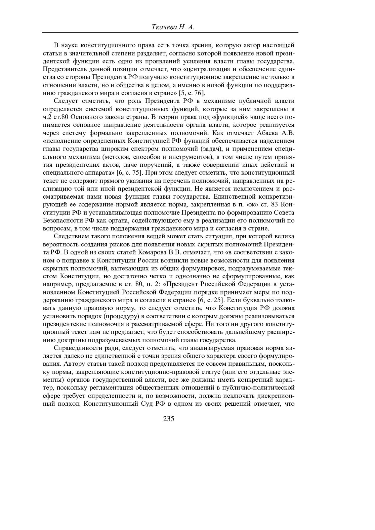ТКАЧЕВА Н. А. ГРАЖДАНСКИЙ МИР И СОГЛАСИЕ КАК КОНСТИТУЦИОННО-ПРАВОВАЯ ЦЕННОСТЬ И НОВАЯ ФУНКЦИЯ ПРЕЗИДЕНТА РОССИЙСКОЙ ФЕДЕРАЦИИ В КОНТЕКСТЕ КОНСТИТУЦИОННОЙ РЕФОРМЫ 2020 ГОДА // УЧЕНЫЕ ЗАПИСКИ КРЫМСКОГО ФЕДЕРАЛЬНОГО УНИВЕРСИТЕТА ИМЕНИ В. И. ВЕРНАДСКОГО. ЮРИДИЧЕСКИЕ НАУКИ. 2025. ТОМ 11(77). №1