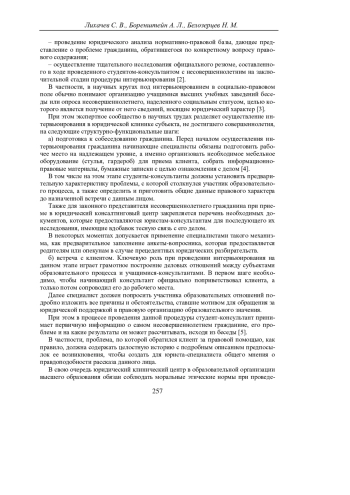 Как показывает современная юридическая практика, предоставление лицам, не достигшим совершеннолетнего возраста, консалтинговых услуг в правовых клинических центрах происходит поэтапно. Основная роль в организации определенной схемы по оказанию юридического консалтинга в социальном секторе рыночных услуг при этом отводится начинающим специалистам-правоведам и юристам консультантам [1].