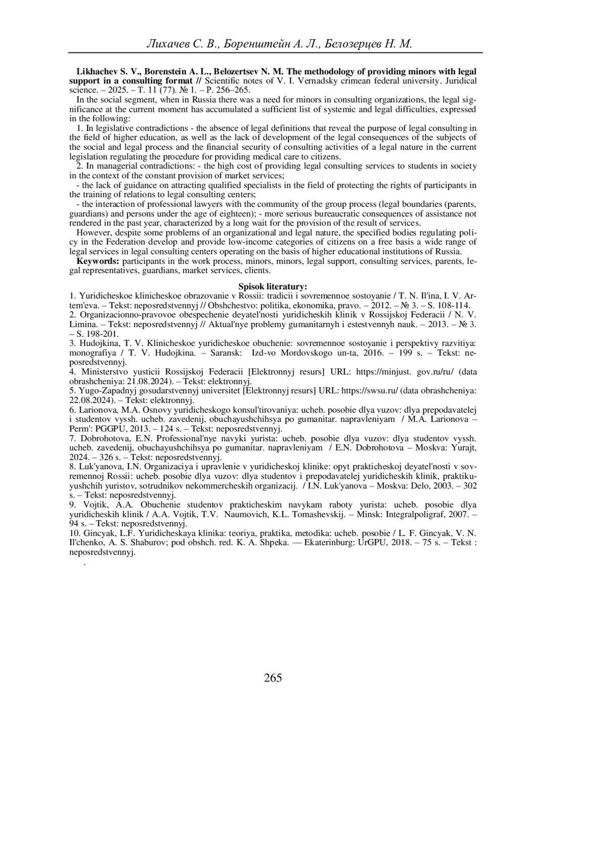 10. Гинцяк, Л.Ф. Юридическая клиника: теория, практика, методика: учеб. пособие / Л. Ф. Гинцяк, В. Н. Ильченко, А. С. Шабуров; под общ. ред. К. А. Шпека. - Екатеринбург: УрГПУ, 2018. - 75 с. -Текст: непосредственный. EDN: XUGTHN
