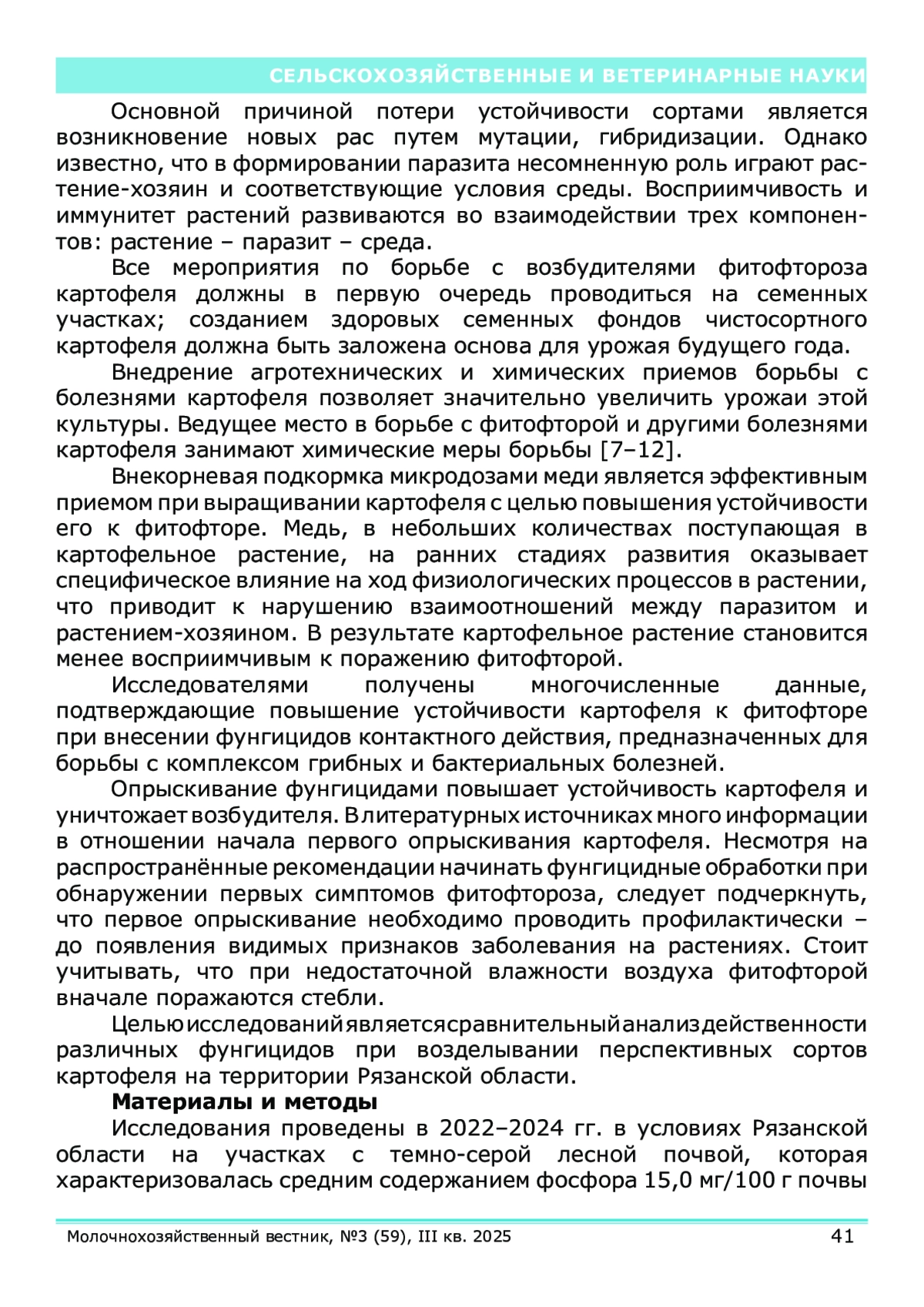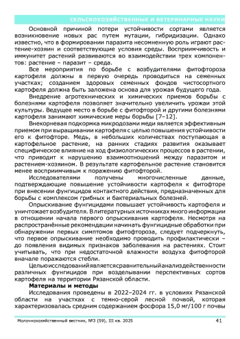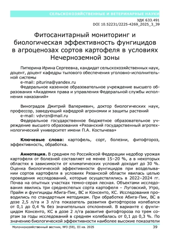 Статья: Фитосанитарный мониторинг и биологическая эффективность фунгицидов в агроценозах сортов картофеля в условиях Нечерноземной зоны (2025)
