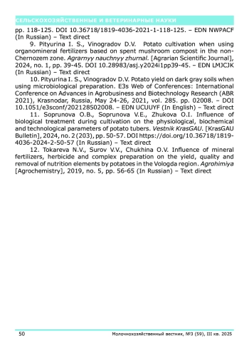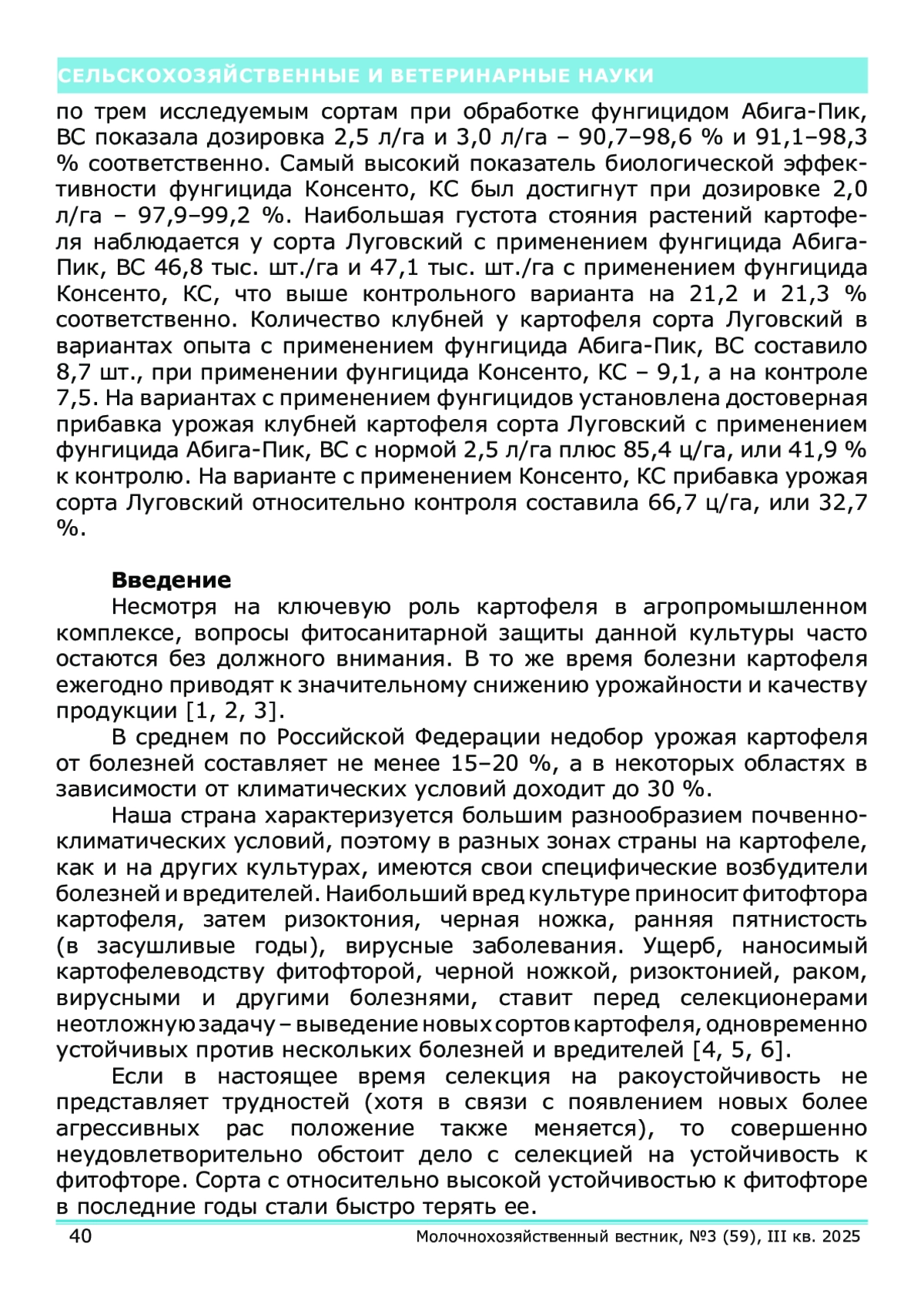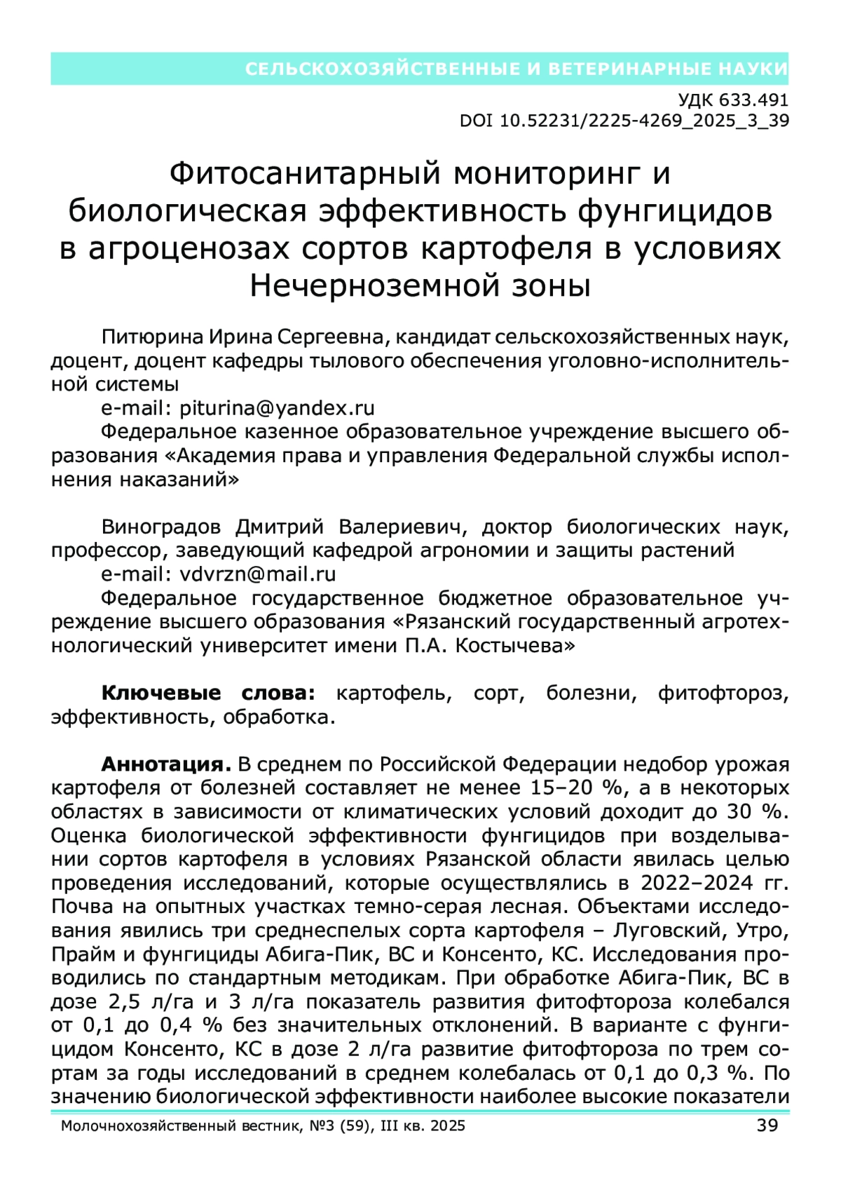 ПИТЮРИНА И. С., ВИНОГРАДОВ Д. В. ФИТОСАНИТАРНЫЙ МОНИТОРИНГ И БИОЛОГИЧЕСКАЯ ЭФФЕКТИВНОСТЬ ФУНГИЦИДОВ В АГРОЦЕНОЗАХ СОРТОВ КАРТОФЕЛЯ В УСЛОВИЯХ НЕЧЕРНОЗЕМНОЙ ЗОНЫ // МОЛОЧНОХОЗЯЙСТВЕННЫЙ ВЕСТНИК. 2025. № 3 (59)
