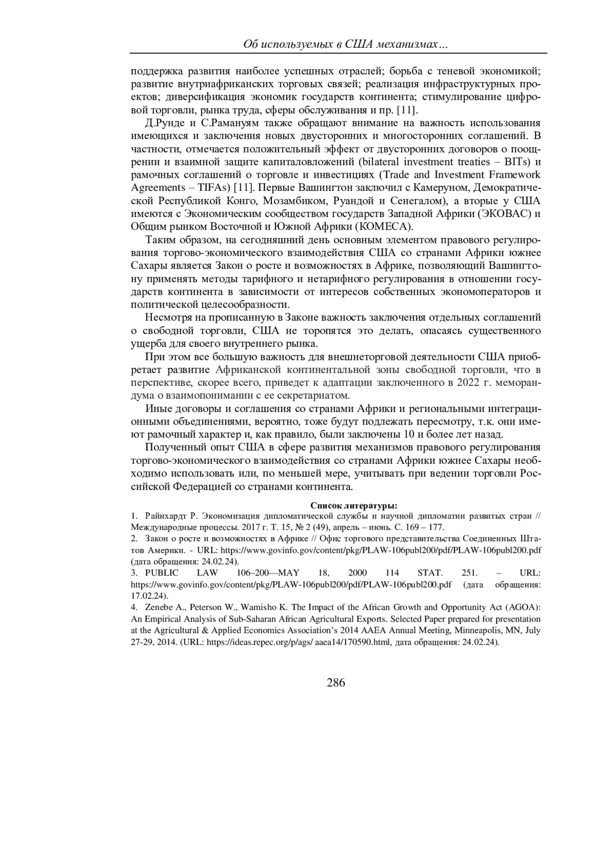 4. Zenebe A., Peterson W., Wamisho K. The Impact of the African Growth and Opportunity Act (AGOA): An Empirical Analysis of Sub-Saharan African Agricultural Exports. Selected Paper prepared for presentation at the Agricultural & Applied Economics Association‘s 2014 AAEA Annual Meeting, Minneapolis, MN, July 27-29, 2014. (URL: https://ideas.repec.org/p/ags/aaea14/170590.html, дата обращения: 24.02.24).