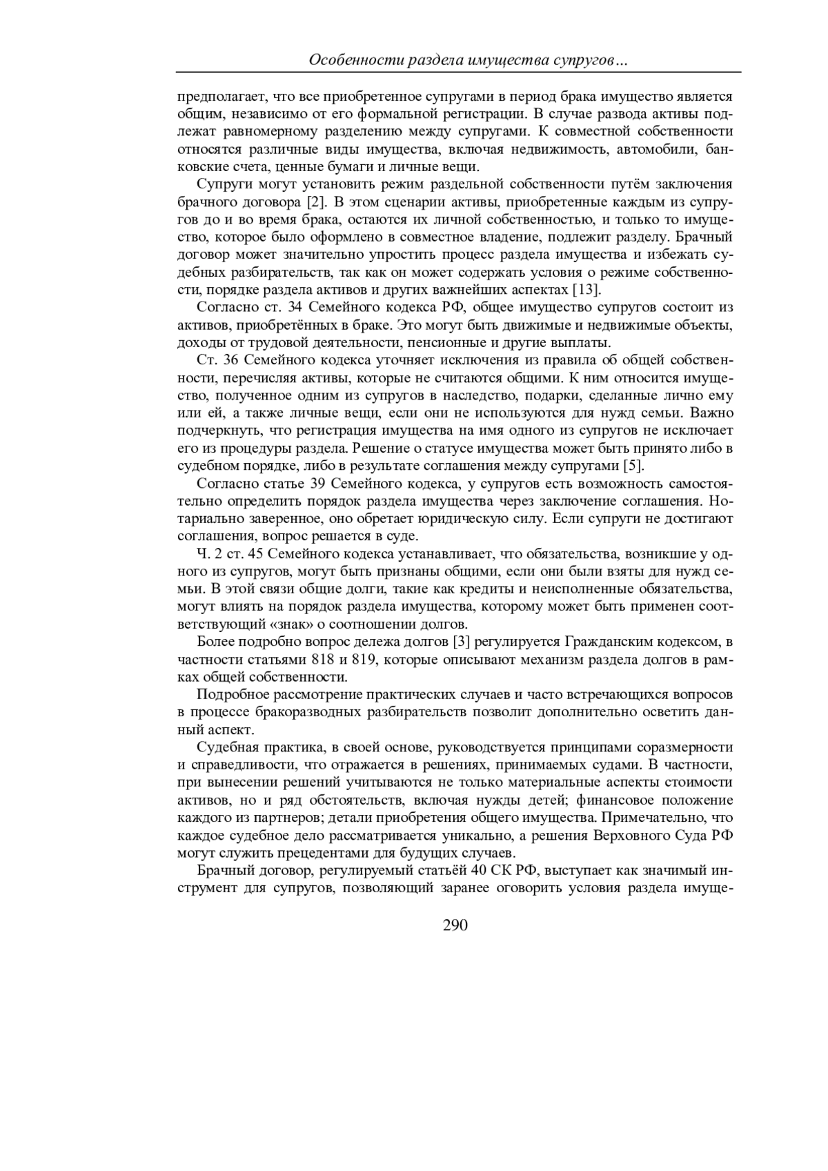 Особенности раздела имущества супругов в соответствии с нормами действующего законодательства РФ включают положения Семейного кодекса Российской Федерации (СК РФ). Раздел общего имущества супругов возможен как в период брака, так и после его расторжения по требованию любого из супругов или заявлению кредитора. Общее имущество может быть разделено между супругами по их соглашению, которое должно быть нотариально удостоверено. В случае спора раздел производится судом, определяющим долю каждого супруга в имуществе. Раздел имущества супругов - это важный процесс, который возникает в случае расторжения брака. В Российской Федерации данный процесс регулируется рядом нормативно-правовых актов (НПА), основным из которых является Семейный кодекс Российской Федерации (СК РФ), который устанавливает правила и процедуры, применимые к разделу имущества. В данной статье подробно рассмотрим ключевые аспекты, касающиеся раздела активов супругов, выделив как нормотворческие, так и практические моменты.