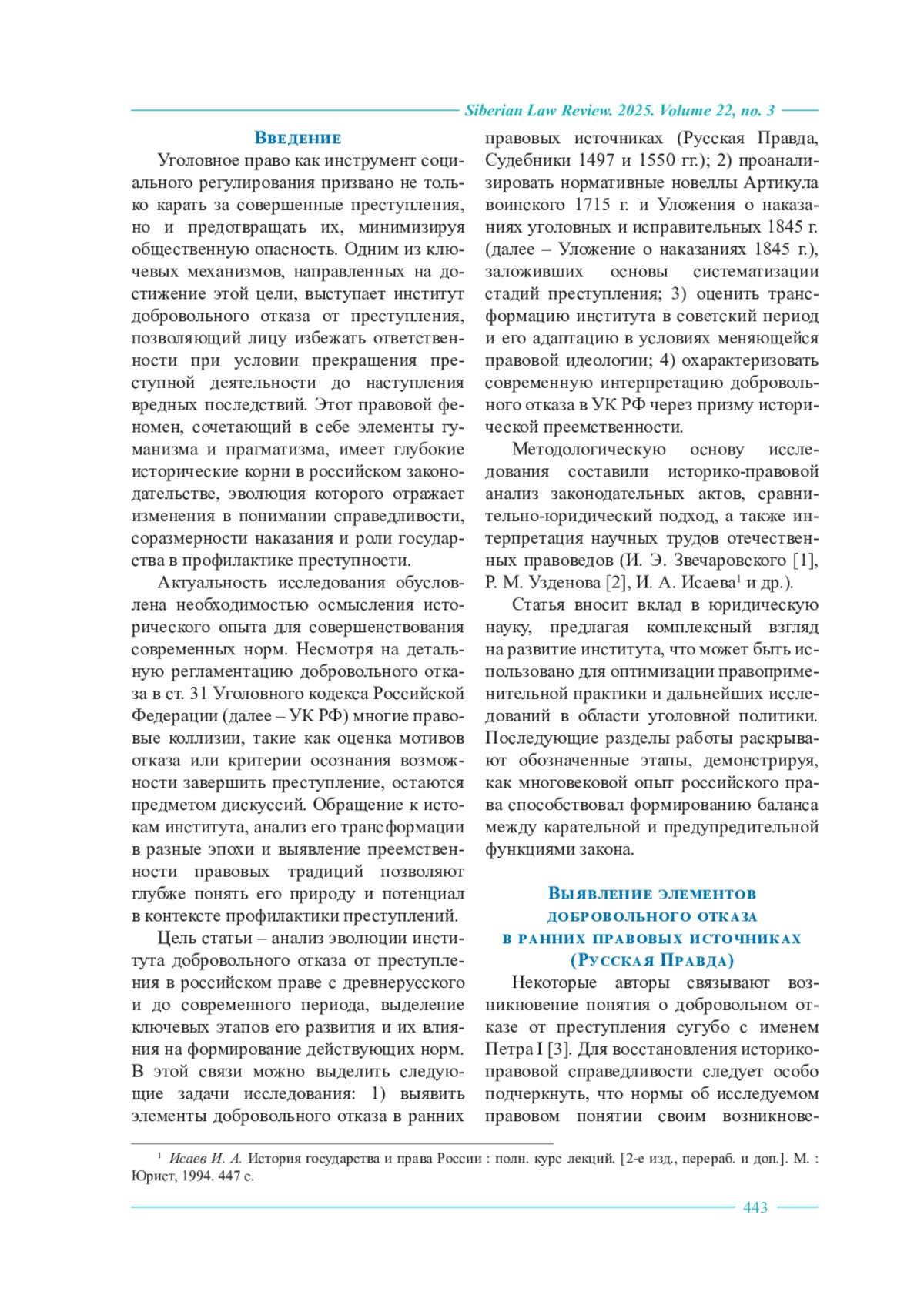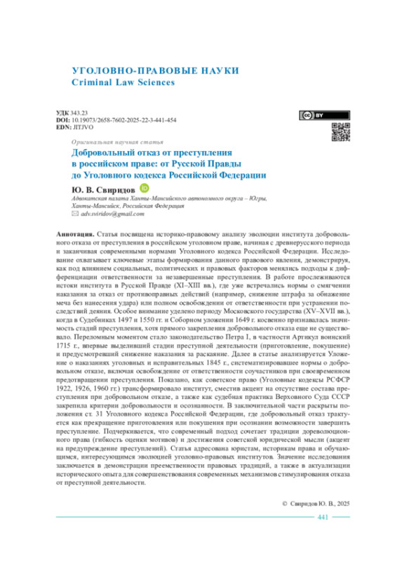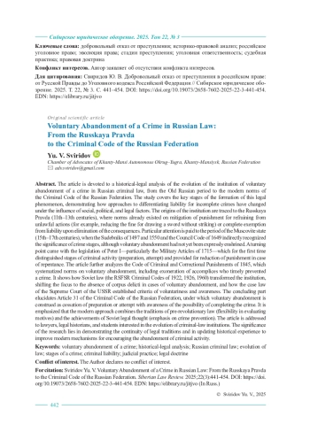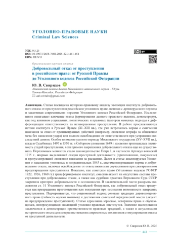 Статья посвящена историко-правовому анализу эволюции института добровольного отказа от преступления в российском уголовном праве, начиная с древнерусского периода и заканчивая современными нормами Уголовного кодекса Российской Федерации. Исследование охватывает ключевые этапы формирования данного правового явления, демонстрируя, как под влиянием социальных, политических и правовых факторов менялись подходы к дифференциации ответственности за незавершенные преступления. В работе прослеживаются истоки института в Русской Правде (XI–XIII вв.), где уже встречались нормы о смягчении наказания за отказ от противоправных действий (например, снижение штрафа за обнажение меча без нанесения удара) или полном освобождении от ответственности при устранении последствий деяния. Особое внимание уделено периоду Московского государства (XV–XVII вв.), когда в Судебниках 1497 и 1550 гг. и Соборном уложении 1649 г. косвенно признавалась значимость стадий преступления, хотя прямого закрепления добровольного отказа еще не существовало. Переломным моментом стало законодательство Петра I, в частности Артикул воинский 1715 г., впервые выделивший стадии преступной деятельности (приготовление, покушение) и предусмотревший снижение наказания за раскаяние. Далее в статье анализируется Уложение о наказаниях уголовных и исправительных 1845 г., систематизировавшее нормы о добровольном отказе, включая освобождение от ответственности соучастников при своевременном предотвращении преступления. Показано, как советское право (Уголовные кодексы РСФСР 1922, 1926, 1960 гг.) трансформировало институт, сместив акцент на отсутствие состава преступления при добровольном отказе, а также как судебная практика Верховного Суда СССР закрепила критерии добровольности и осознанности. В заключительной части раскрыты положения ст. 31 Уголовного кодекса Российской Федерации, где добровольный отказ трактуется как прекращение приготовления или покушения при осознании возможности завершить преступление. Подчеркивается, что современный подход сочетает традиции дореволюционного права (гибкость оценки мотивов) и достижения советской юридической мысли (акцент на предупреждение преступлений). Статья адресована юристам, историкам права и обучающимся, интересующимся эволюцией уголовно-правовых институтов. Значение исследования заключается в демонстрации преемственности правовых традиций, а также в актуализации исторического опыта для совершенствования современных механизмов стимулирования отказа от преступной деятельности.