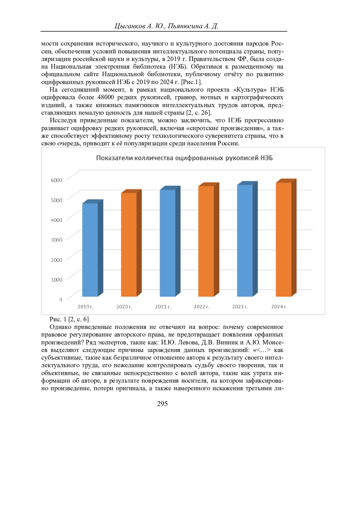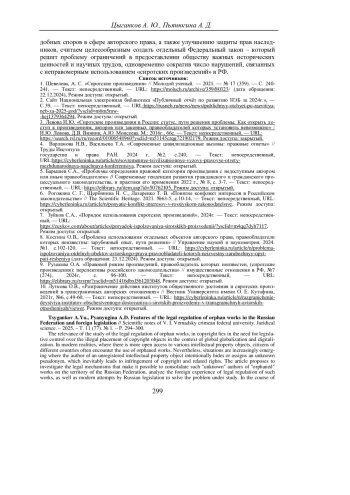 ЦЫГАНКОВ А. Ю., ПЬЯНЮГИНА А. Д. ОСОБЕННОСТИ ПРАВОВОГО РЕГУЛИРОВАНИЯ СИРОТСКИХ ПРОИЗВЕДЕНИЙ В РОССИЙСКОЙ ФЕДЕРАЦИИ И В ЗАРУБЕЖНОМ ЗАКОНОДАТЕЛЬСТВЕ // УЧЕНЫЕ ЗАПИСКИ КРЫМСКОГО ФЕДЕРАЛЬНОГО УНИВЕРСИТЕТА ИМЕНИ В. И. ВЕРНАДСКОГО. ЮРИДИЧЕСКИЕ НАУКИ. 2025. ТОМ 11(77). №1