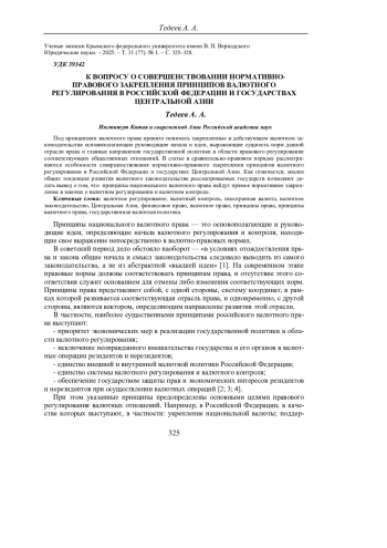 Статья: К ВОПРОСУ О СОВЕРШЕНСТВОВАНИИ НОРМАТИВНОПРАВОВОГО ЗАКРЕПЛЕНИЯ ПРИНЦИПОВ ВАЛЮТНОГО РЕГУЛИРОВАНИЯ В РОССИЙСКОЙ ФЕДЕРАЦИИ И ГОСУДАРСТВАХ ЦЕНТРАЛЬНОЙ АЗИИ (2025)