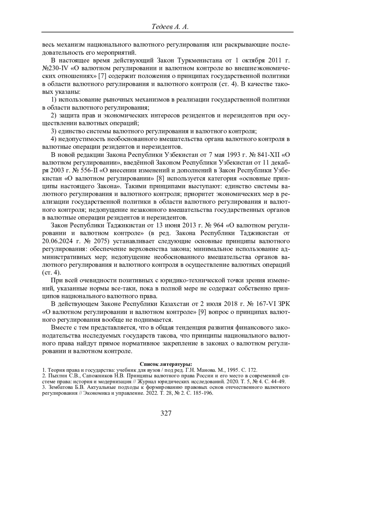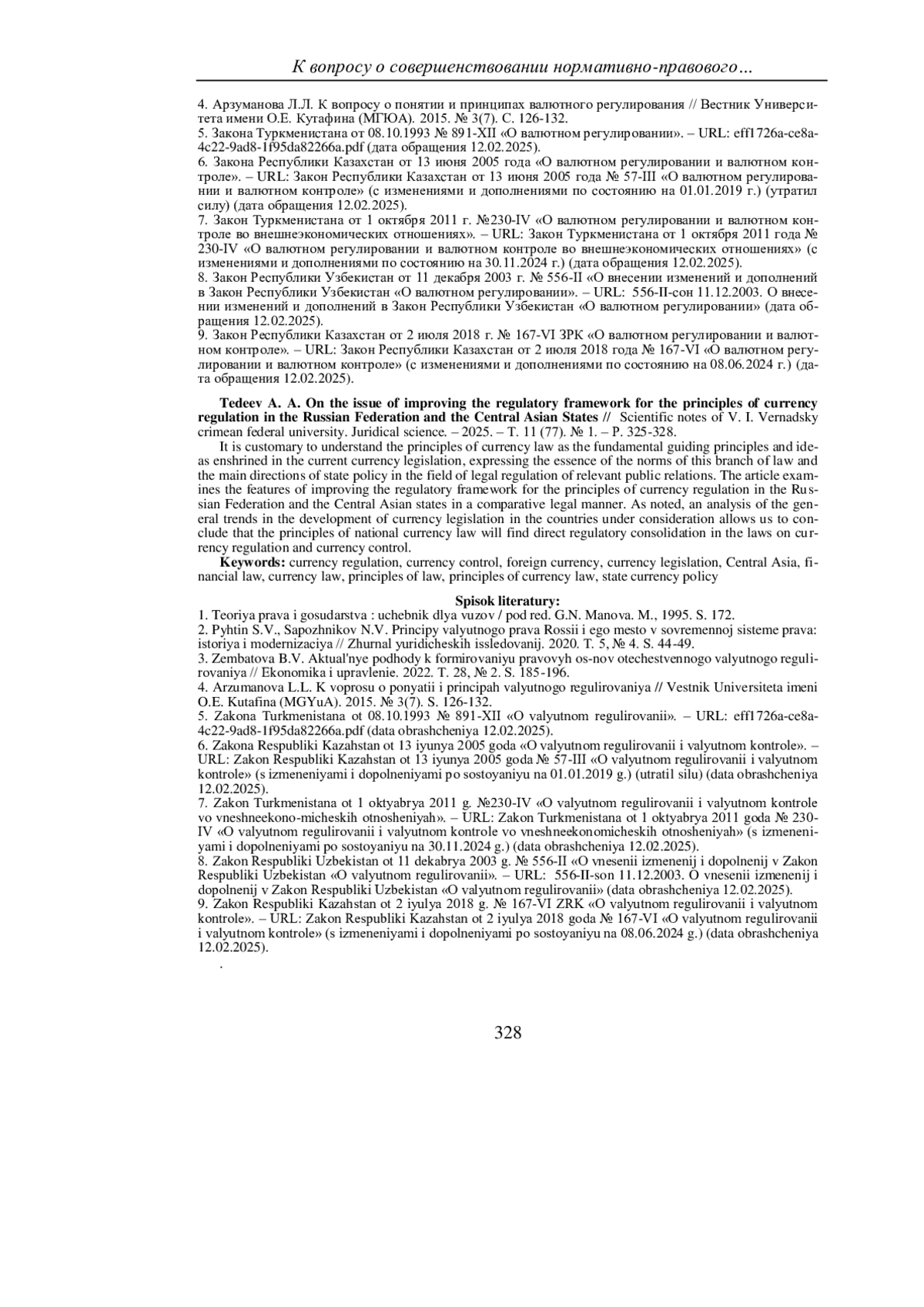 ТЕДЕЕВ А. А. К ВОПРОСУ О СОВЕРШЕНСТВОВАНИИ НОРМАТИВНОПРАВОВОГО ЗАКРЕПЛЕНИЯ ПРИНЦИПОВ ВАЛЮТНОГО РЕГУЛИРОВАНИЯ В РОССИЙСКОЙ ФЕДЕРАЦИИ И ГОСУДАРСТВАХ ЦЕНТРАЛЬНОЙ АЗИИ // УЧЕНЫЕ ЗАПИСКИ КРЫМСКОГО ФЕДЕРАЛЬНОГО УНИВЕРСИТЕТА ИМЕНИ В. И. ВЕРНАДСКОГО. ЮРИДИЧЕСКИЕ НАУКИ. 2025. ТОМ 11(77). №1