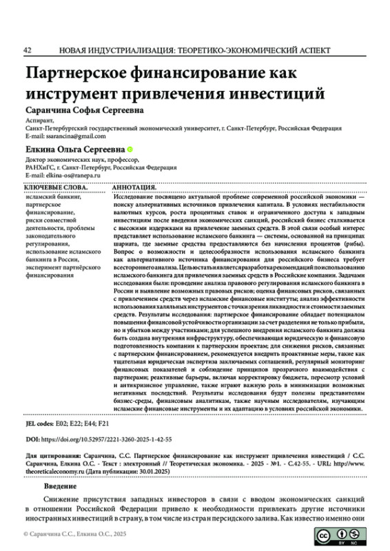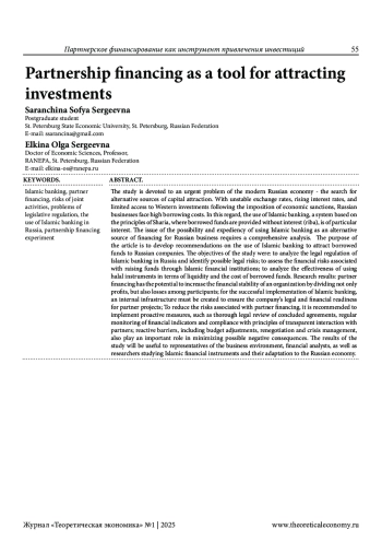 САРАНЧИНА С. С., ЕЛКИНА О. С. ПАРТНЕРСКОЕ ФИНАНСИРОВАНИЕ КАК ИНСТРУМЕНТ ПРИВЛЕЧЕНИЯ ИНВЕСТИЦИЙ // ТЕОРЕТИЧЕСКАЯ ЭКОНОМИКА. 2025. № 1 (121)