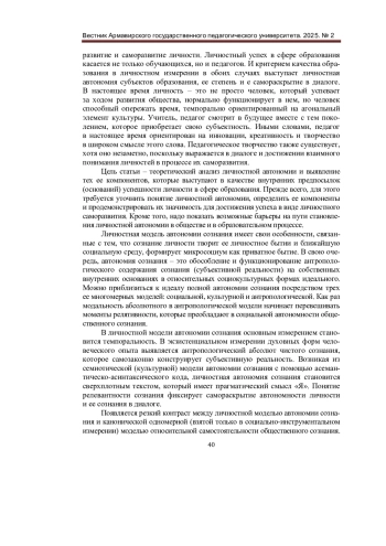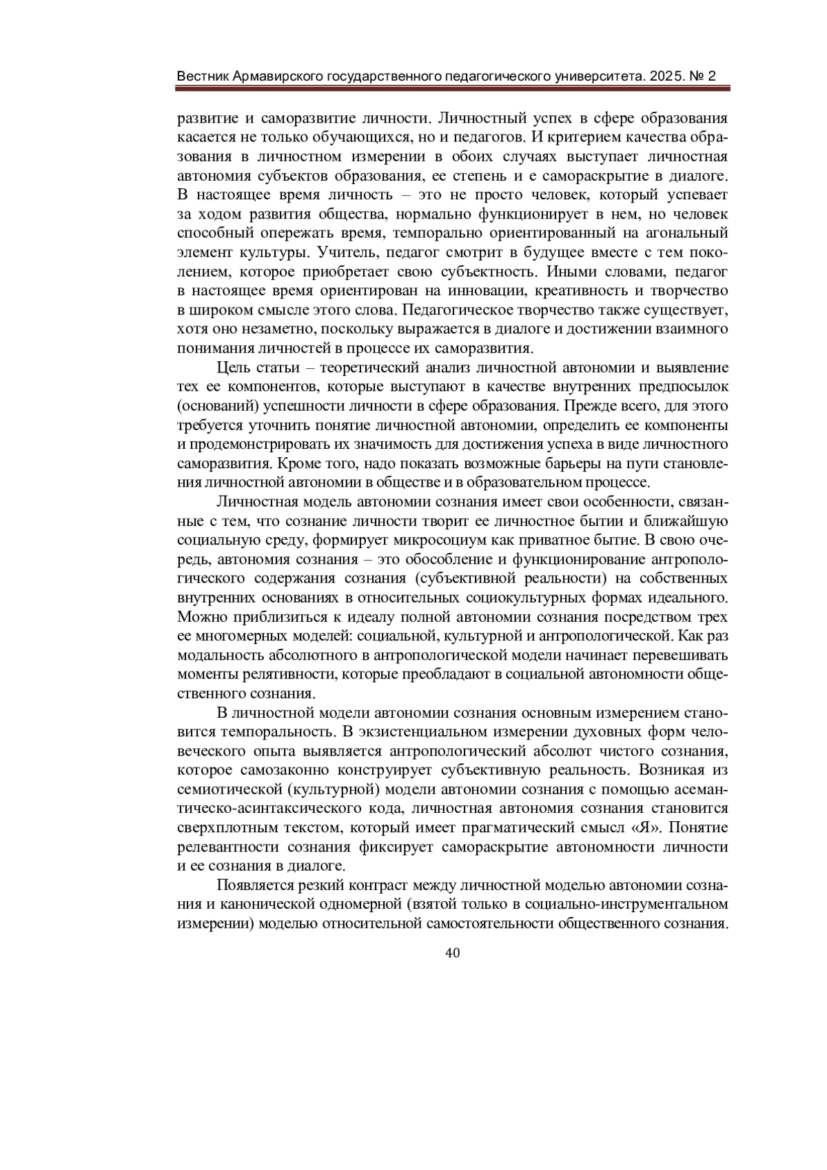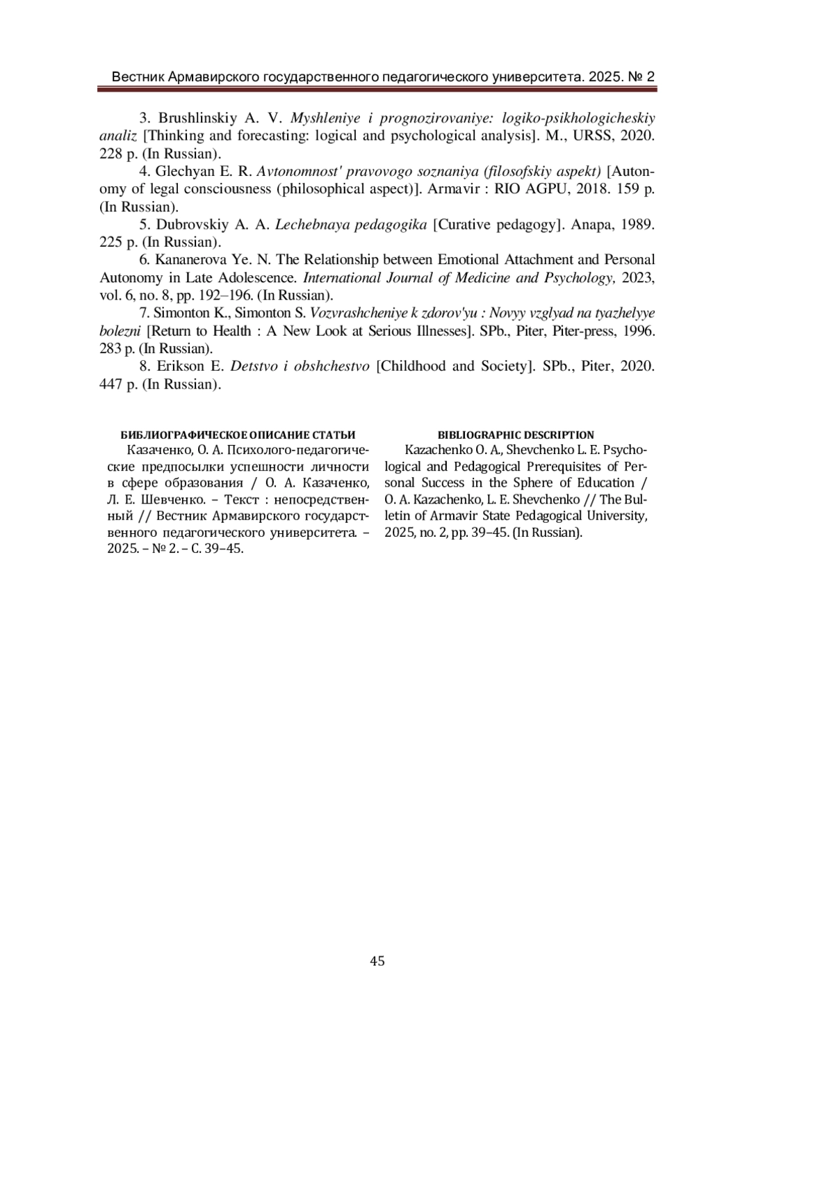КАЗАЧЕНКО О. А., ШЕВЧЕНКО Л. Е. ПСИХОЛОГО-ПЕДАГОГИЧЕСКИЕ ПРЕДПОСЫЛКИ УСПЕШНОСТИ ЛИЧНОСТИ В СФЕРЕ ОБРАЗОВАНИЯ // ВЕСТНИК АРМАВИРСКОГО ГОСУДАРСТВЕННОГО ПЕДАГОГИЧЕСКОГО УНИВЕРСИТЕТА. 2025. № 2