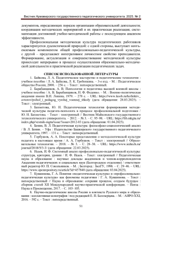 5. Горбушов, А. А. Некоторые представления о методологической культуре педагога в настоящее время / А. А. Горбушов. - Текст: электронный // Образовательные технологии. - 2018. - № 3. - С. 28-38. - URL: https://www.iedtech.ru/journal/2018/5/3-3/(дата обращения: 22.03.2025).