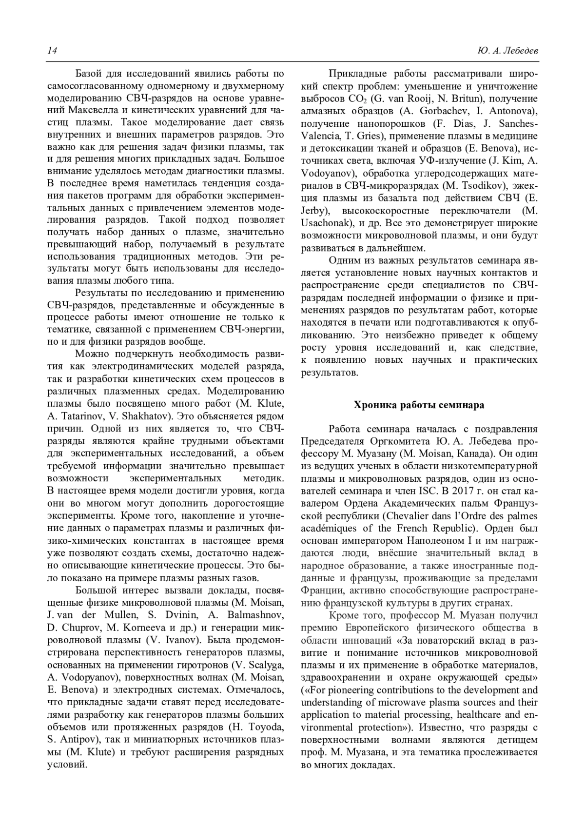 Лебедев Ю. А. 10-й Международный научный семинар по СВЧ-разрядам – X-th International Workshop on Micro-wave Discharges: Fundamentals and Applications (MD-10) 11