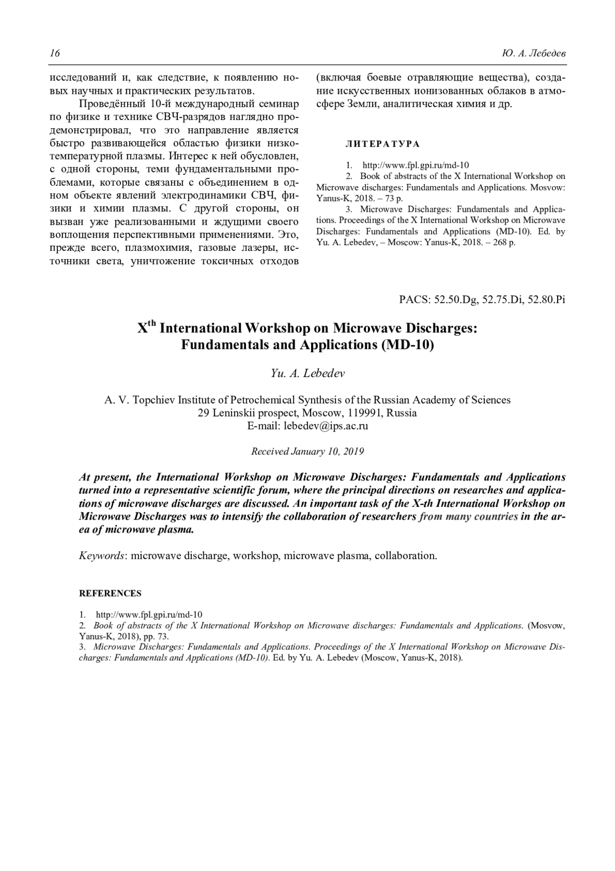 3. Microwave Discharges: Fundamentals and Applications. Proceedings of the X International Workshop on Microwave Discharges: Fundamentals and Applications (MD-10). Ed. by Yu. A. Lebedev (Moscow, Yanus-K, 2018).