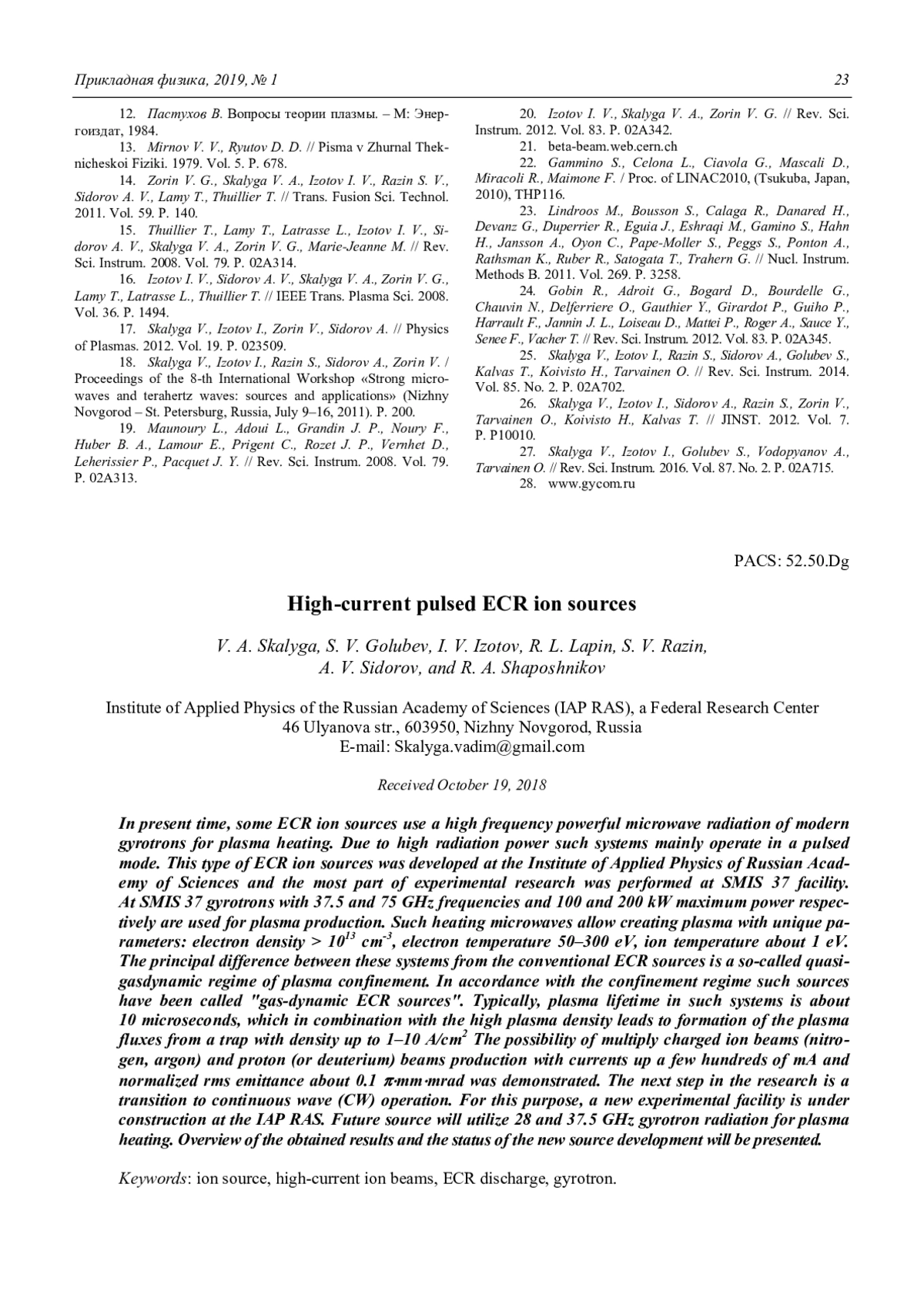 20. Izotov I. V., Skalyga V. A., Zorin V. G. // Rev. Sci. Instrum. 2012. Vol. 83. P. 02A342.