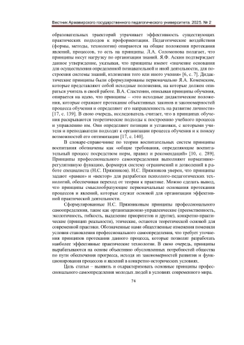 В статье актуализирована проблема становления профессионального самоопределения школьников в современных социально-экономических реалиях, связанных с нестабильностью современного общества. Обусловлена необходимость уточнения принципов становления профессионального самоопределения, обозначена необходимость опоры на принципы гуманистической направленности, незавершимости, природосообразности, вариативности, культуросообразности, принадлежности к профессиональному сообществу становления профессионального самоопределения в общеобразовательных организациях в связи с изменчивостью профессиональной среды и «распространением нигилистического умонастроения, распространяющегося, в том числе, и на педагогические смыслы формирования субъекта труда» [20, с. 127]. В свою очередь, обозначенные принципы являются первоначальными основаниями протекания становления профессионального самоопределения, которые служат основой для организации эффективной практической деятельности специалиста (разработки педагогических технологий, создания условий) в рамках профориентационной работы в общеобразовательных организациях.