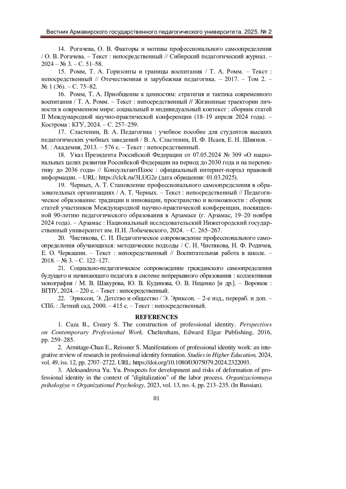 2. Reissner S. Manifestations of professional identity work: an integrative review of research in professional identity formation / S. Reissner, E. Armitage-Chan // Studies in Higher Education. - 2024. - Vol. 49. - Iss. 12. - Pp. 2707-2722. - URL:. DOI: 10.1080/03075079.2024.2322093