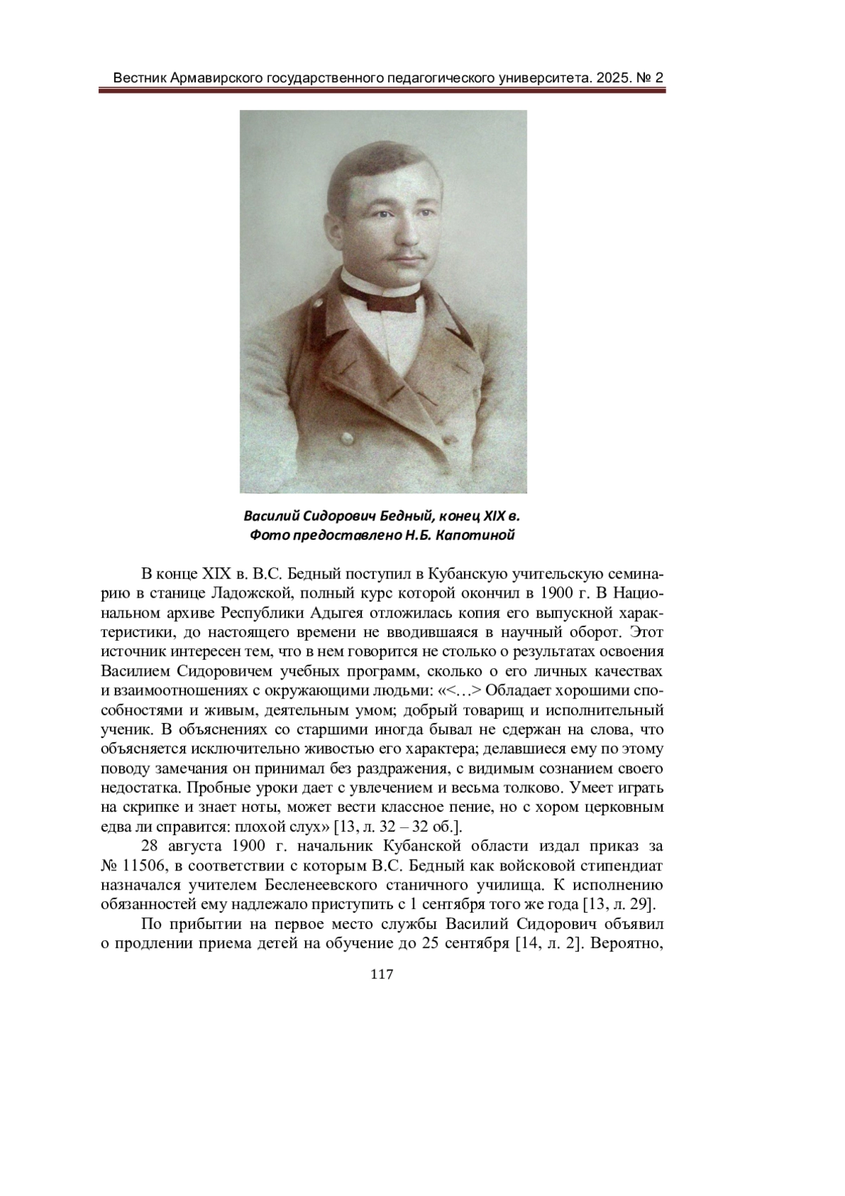 КОВАЛЕНКО Н. С. ИЗ ЖИЗНИ УЧИТЕЛЕЙ ПРЕДГОРНОЙ КУБАНИ НА РУБЕЖЕ XIX-XX ВВ.: ВАСИЛИЙ СИДОРОВИЧ БЕДНЫЙ // ВЕСТНИК АРМАВИРСКОГО ГОСУДАРСТВЕННОГО ПЕДАГОГИЧЕСКОГО УНИВЕРСИТЕТА. 2025. № 2