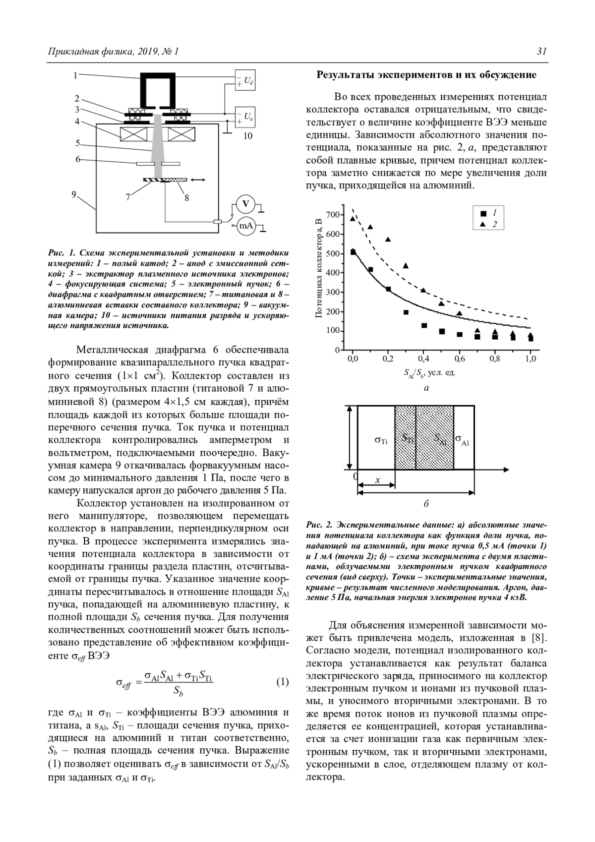 В статье представлены результаты измерения потенциала изолированного коллектора, облучаемого электронным пучком в среднем вакууме, при различных значениях – коэффициента вторичной электронной эмиссии электронов (ВЭЭ). Изменение обеспечено плавным перемещением относительно электронного пучка коллектора, составленного из двух металлов (алюминия и титана) с резко различающимися значениями коэффициента ВЭЭ. Предложена модель, удовлетворительно описывающая измеренную зависимость, и методика, позволяющая по установившемуся потенциалу изолированного коллектора оценивать коэффициент ВЭЭ различных материалов, в том числе и диэлектриков.