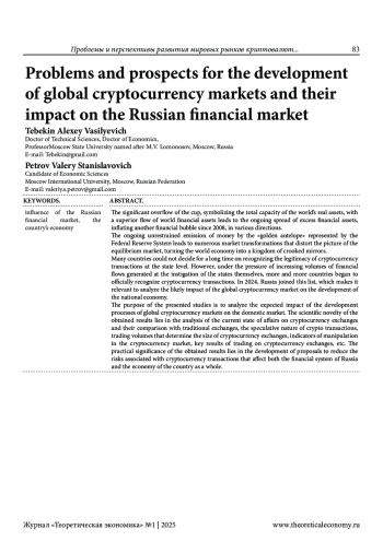 Значительное переполнение чаши, символизирующих совокупную емкость мировых реальных активов, превосходящим потоком мировых финансовых активов приводит к продолжающемуся растеканию избыточных финансовых активов, надувающих очередной финансовый пузырь с 2008 года, в различных направлениях. Продолжающаяся безудержная эмиссия денег «золотой антилопой» в лице ФРС, приводит к многочисленным рыночным трансформациям, искажающим картину равновесного рынка, превращая мировую экономику в королевство кривых зеркал. Многие страны долгое время не могли принять решение относительно признания легитимности операций с криптовалютами на государственном уровне. Однако под давлением нарастающих объемов финансовых потоков, генерируемых с подачи самих же государств, все больше стран стало официально признавать операции с критовалютами. В 2024 году этот список пополнила и Россия, что делает актуальным анализ вероятного влияния мирового рынка криптовалют на развитие национального хозяйства. Целью представленных исследований является анализ ожидаемого влияния процессов развития мировых рынков криптовалют на отечественный рынок. Научная новизна полученных результатов заключается в анализе текущего положения дел на криптовалютных биржах и их сравнения с традиционными биржами, спекулятивного характера криптоопераций, объемов торговли, определяющих размеры криптовалютных бирж, индикаторов манипуляций на криптовалютном рынке, ключевых результатов торговли на криптовалютных биржах и т. д. Практическая значимость полученных результатов заключается в выработке предложений по снижению рисков, связанных с криптовалютными операциями, воздействующих как на финансовую систему России, так и на экономику страны в целом.