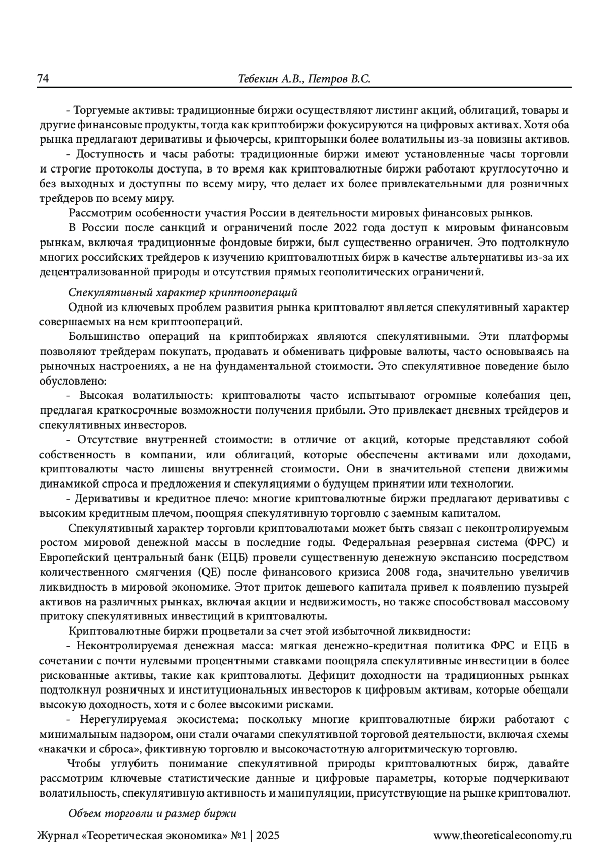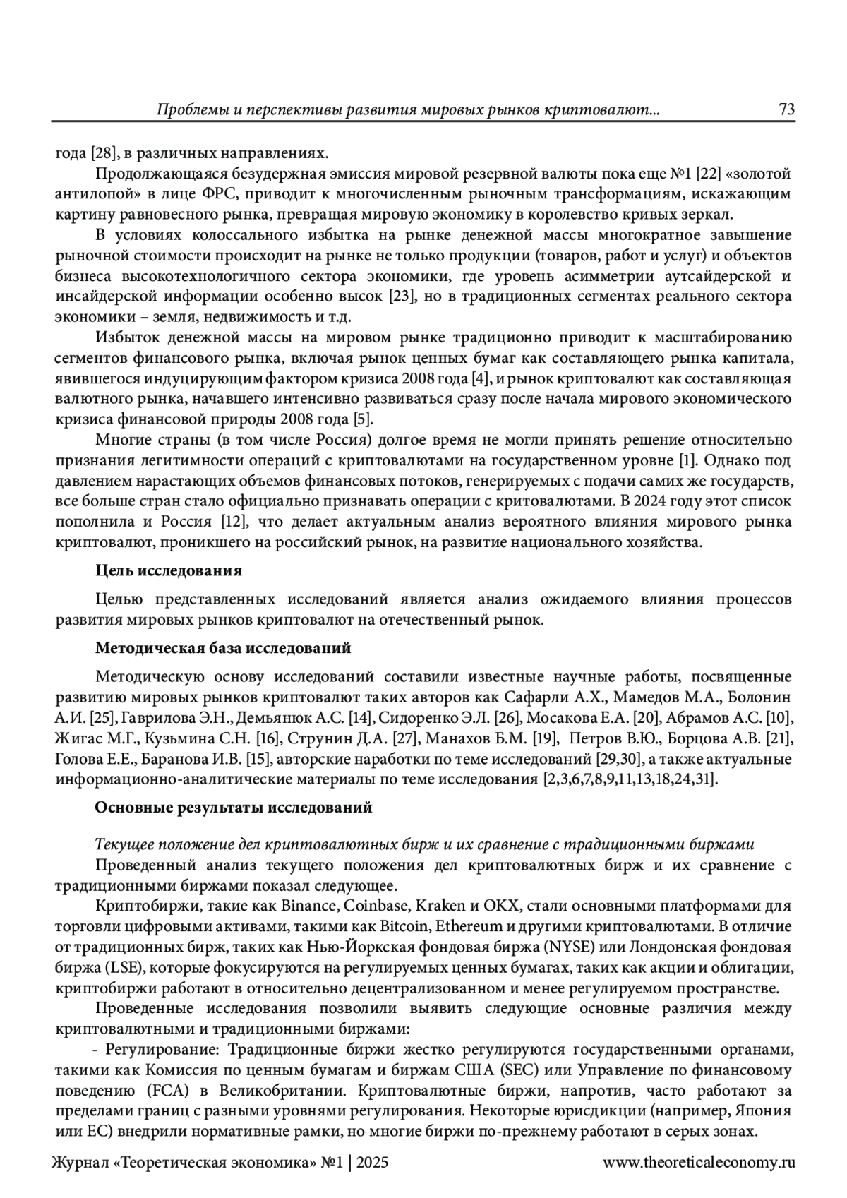 30. Тебекин, А. В., Петров, В. С. Ожидаемые тренды развития мировой криптоиндустрии в 2023 г. // Журнал экономических исследований. 2022. Т. 8. № 5. С. 75-87.