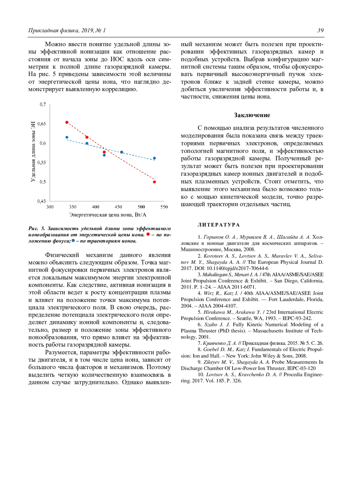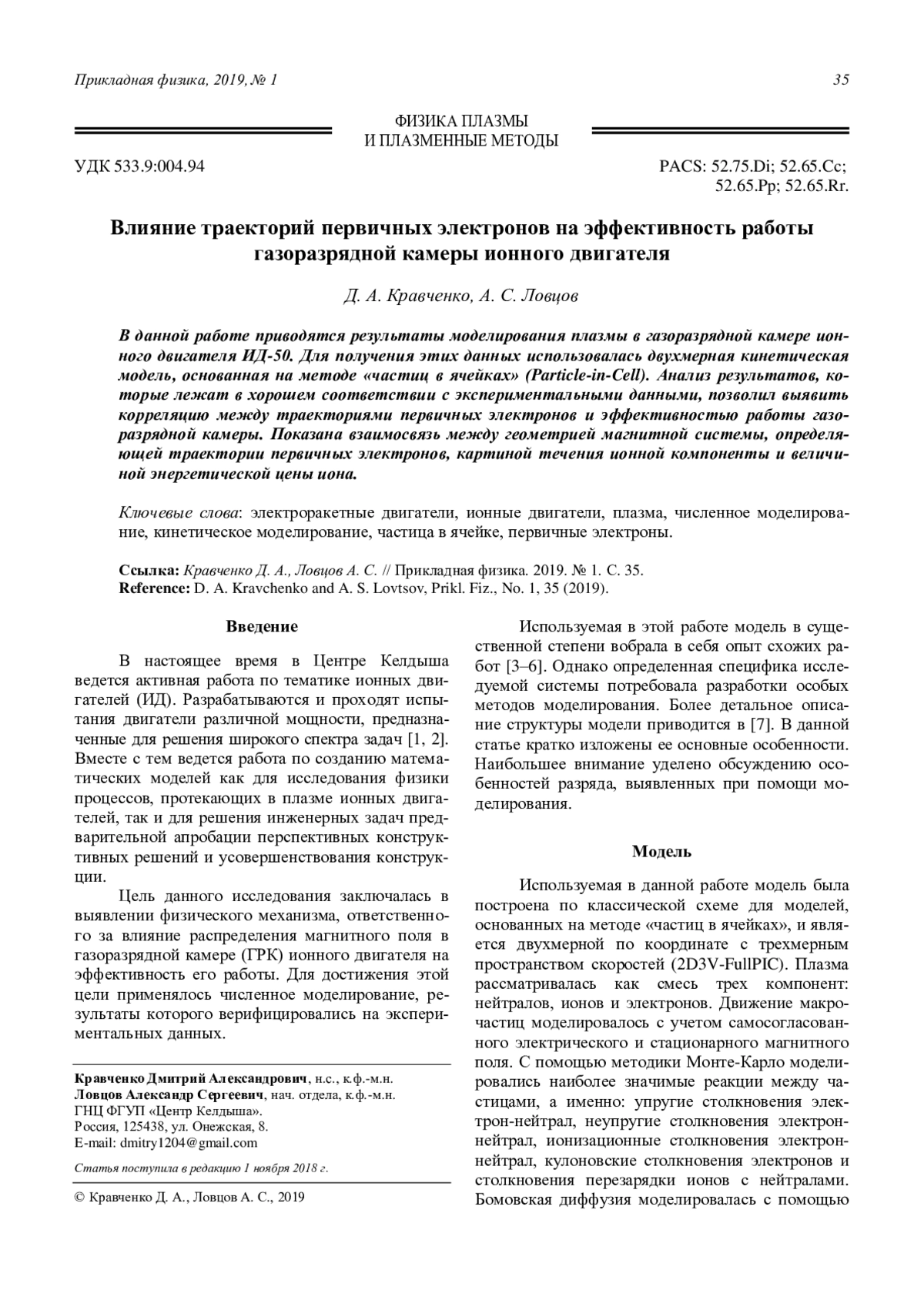 КРАВЧЕНКО Д. А., ЛОВЦОВ А. С. ВЛИЯНИЕ ТРАЕКТОРИЙ ПЕРВИЧНЫХ ЭЛЕКТРОНОВ НА ЭФФЕКТИВНОСТЬ РАБОТЫ ГАЗОРАЗРЯДНОЙ КАМЕРЫ ИОННОГО ДВИГАТЕЛЯ // ПРИКЛАДНАЯ ФИЗИКА. 2019. №1