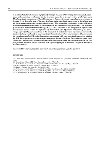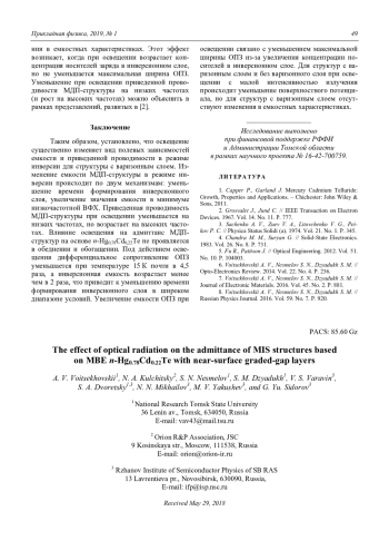 Войцеховский А. В., Кульчицкий Н. А., Несмелов С. Н., Дзядух С. М., Варавин В. С., Дворец-кий С. А., Михайлов Н. Н., Якушев М. В., Сидоров Ю. Г. Воздействие оптического излучения на адмиттанс МДП-структур на основе МЛЭ n-Hg0,78Cd0,22Te с приповерхностными варизонными слоями 46