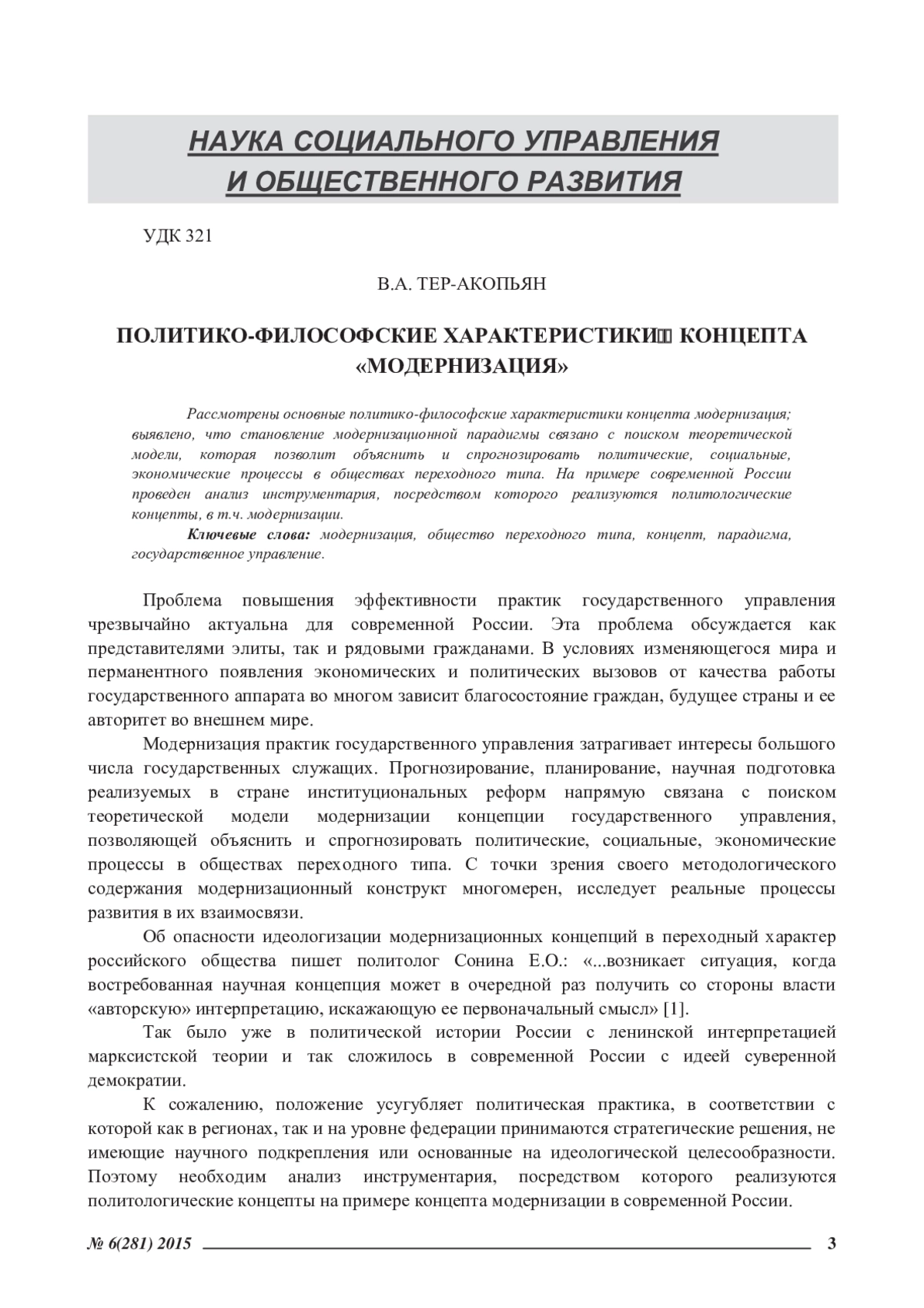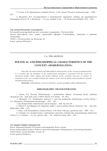 Рассмотрены основные политико-философские характеристики концепта модернизация; выявлено, что становление модернизационной парадигмы связано с поиском теоретической модели, которая позволит объяснить и спрогнозировать политические, социальные, экономические процессы в обществах переходного типа. На примере современной России проведен анализ инструментария, посредством которого реализуются политологические концепты, в т. ч. модернизации.