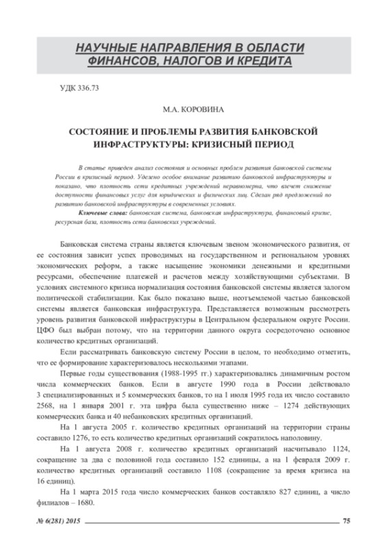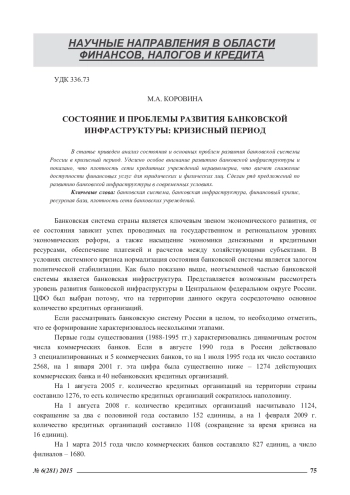В статье приведен анализ состояния и основных проблем развития банковской системы России в кризисный период. Уделено особое внимание развитию банковской инфраструктуры и показано, что плотность сети кредитных учреждений неравномерна, что влечет снижение доступности финансовых услуг для юридических и физических лиц. Сделан ряд предложений по развитию банковской инфраструктуры в современных условиях